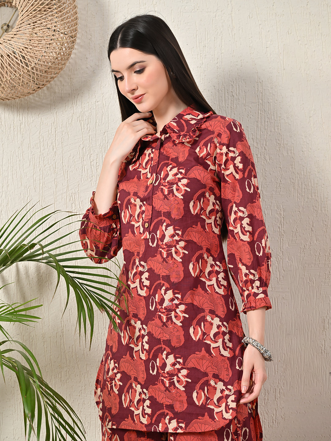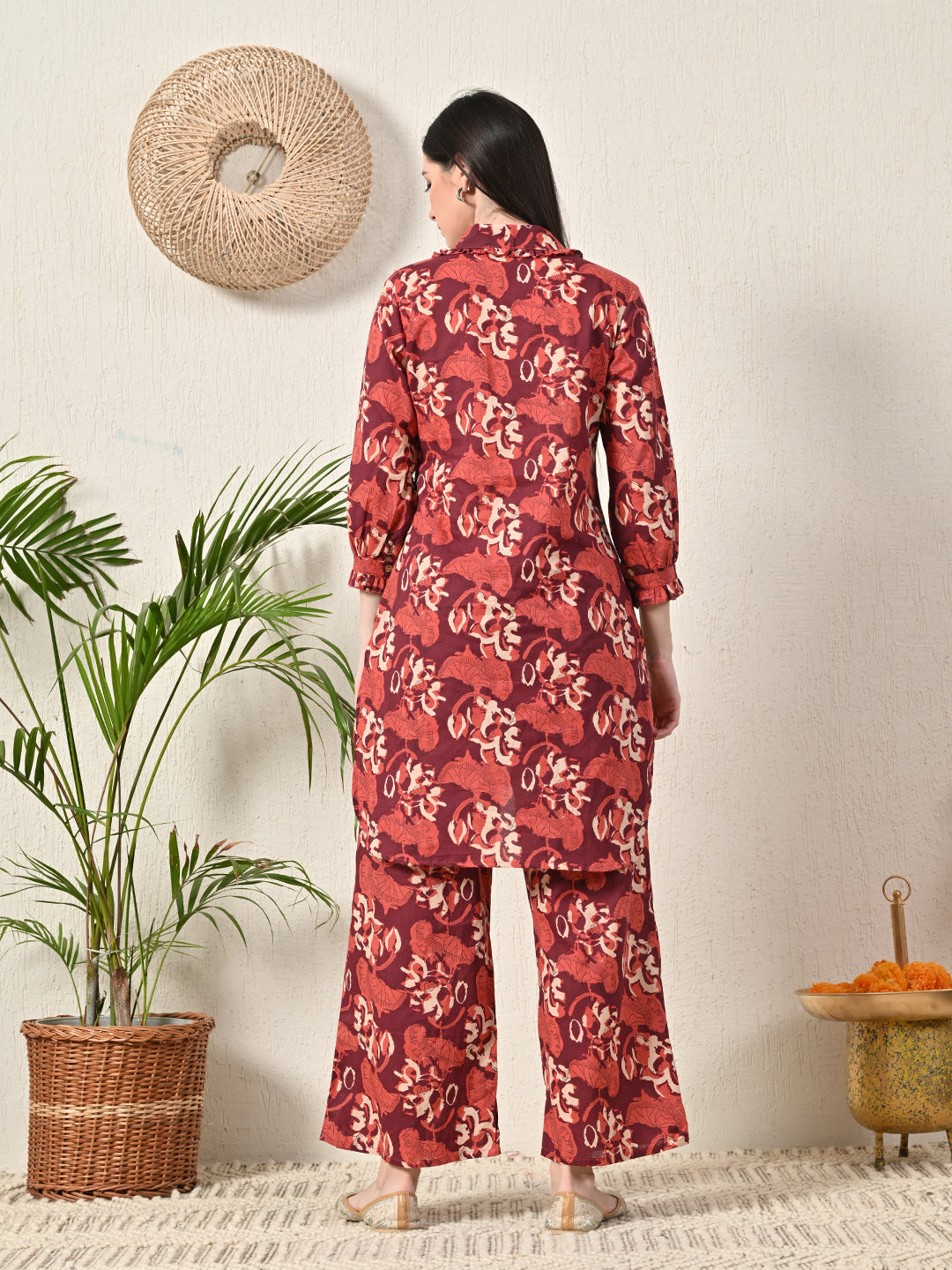 Elevate your everyday wardrobe with our Collared Co-Ord Set, designed to blend timeless elegance with modern comfort. Featuring a stylish kurti with a classic collared neckline and delicate frill detailing, this set exudes subtle sophistication. Crafted from soft and lightweight fabric, it provides comfort and ease of movement throughout the day.The elasticated pants offer a relaxed and flexible fit, making this co-ord set ideal for casual outings, office wear, or brunches. The rich maroon color and stylish design make it a versatile and sophisticated addition to your wardrobe.