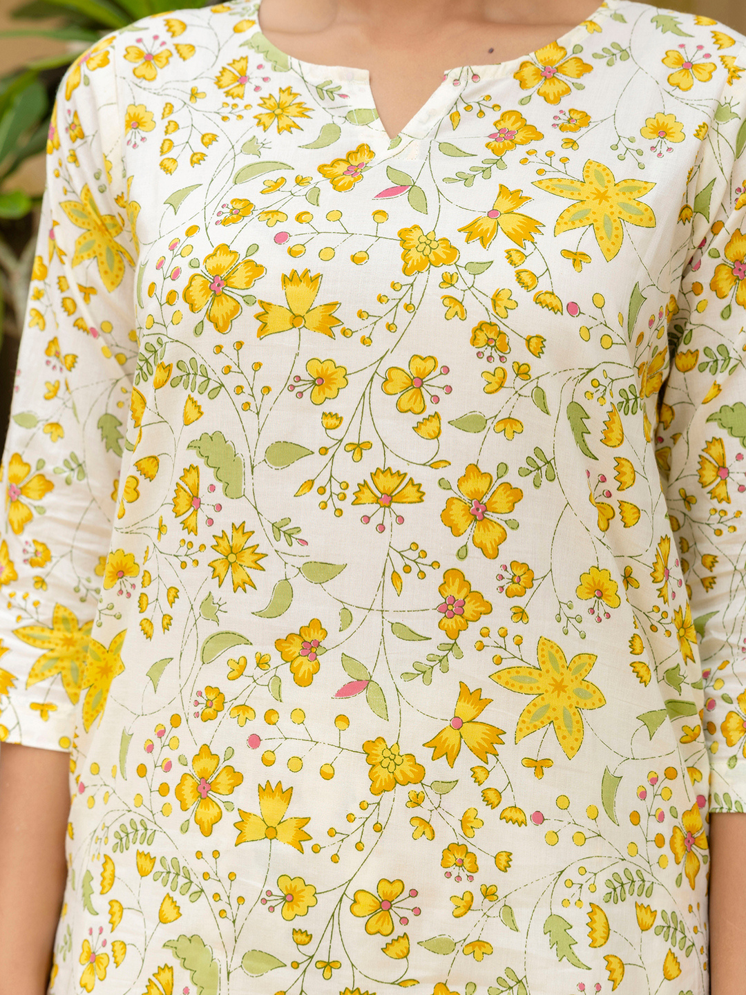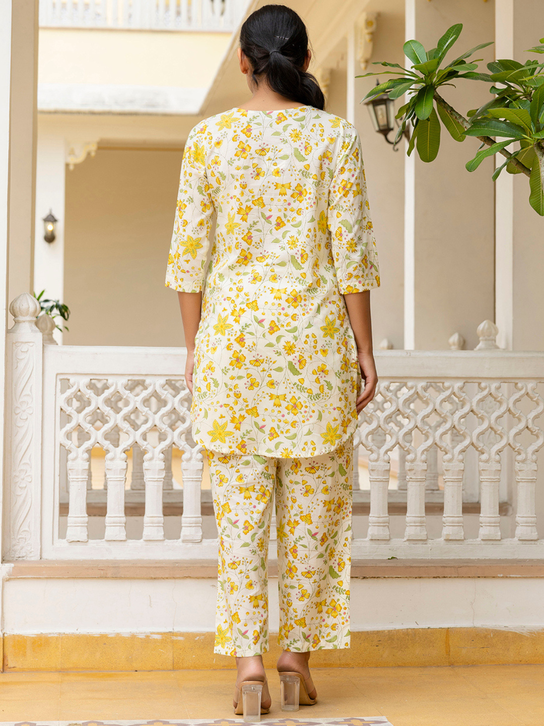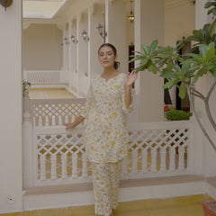 Crafted from pure cotton, this set features a beautifully tailored short kurti with a flattering V-neckline and 3/4 sleeves, enhanced by delicate prints that bring a vibrant yet refined touch to your look. Crafted from soft and breathable cotton fabric, it offers a lightweight and airy feel that keeps you comfortable throughout the day.The coordinated top and matching bottoms are designed in a relaxed fit for effortless movement and a flattering look. The stylish printed pattern adds charm and freshness, making it perfect for casual outings, office wear, travel, or everyday home wear.