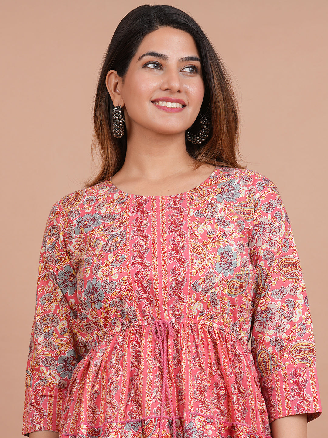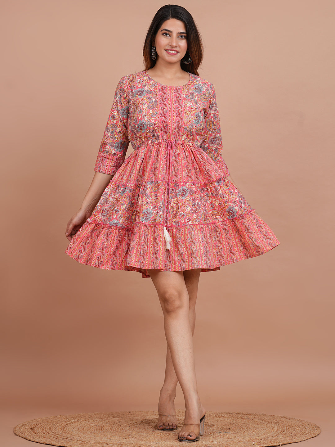 Floral Cotton Flared Dress (S–XXL | 3/4 Sleeves) – Breezy Comfort with Feminine Flow