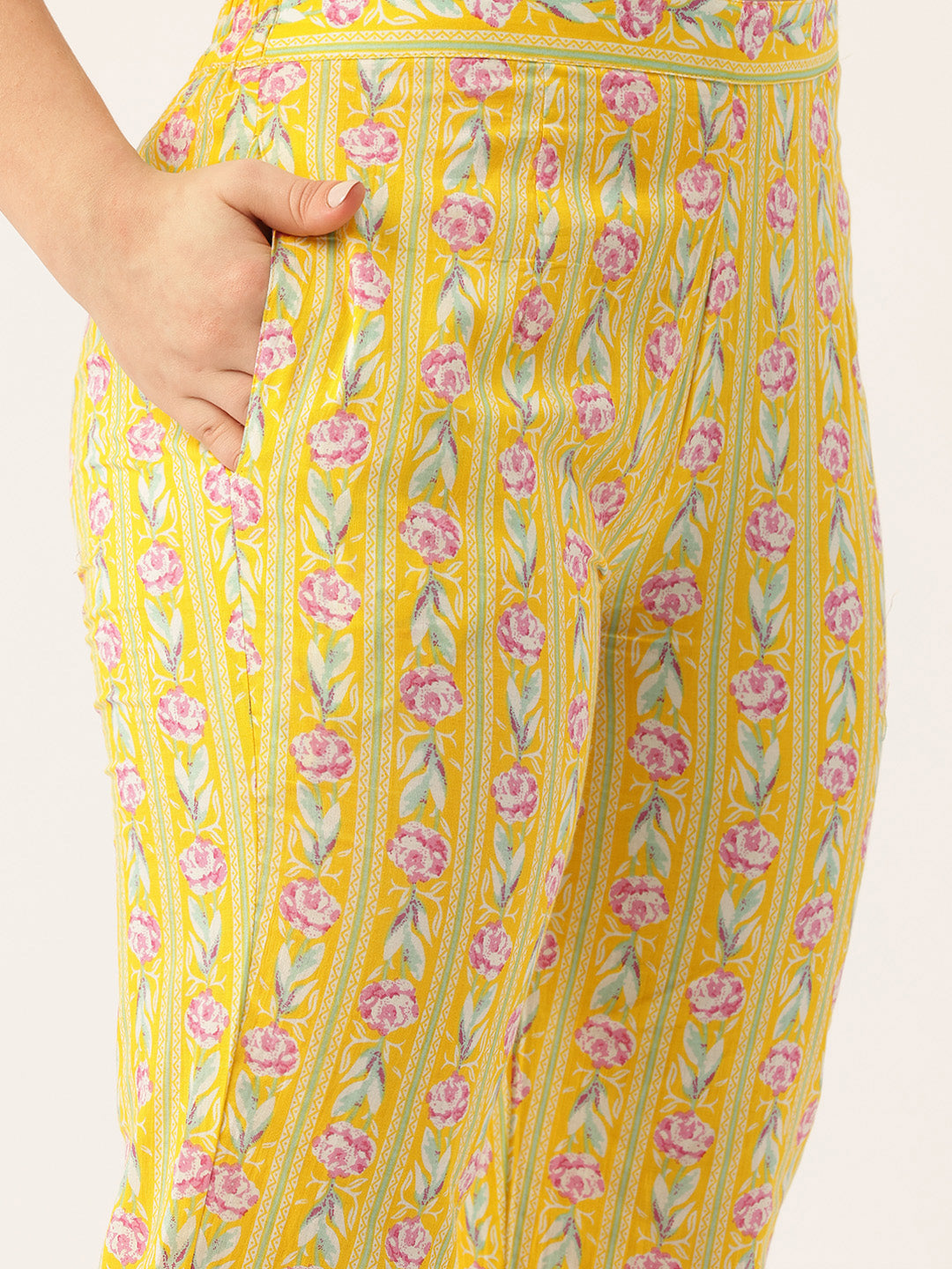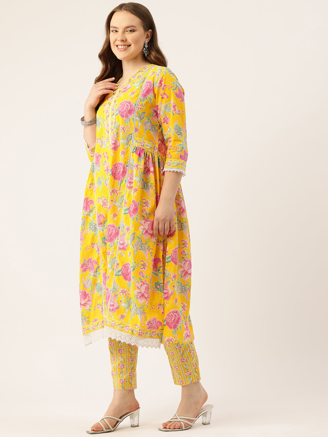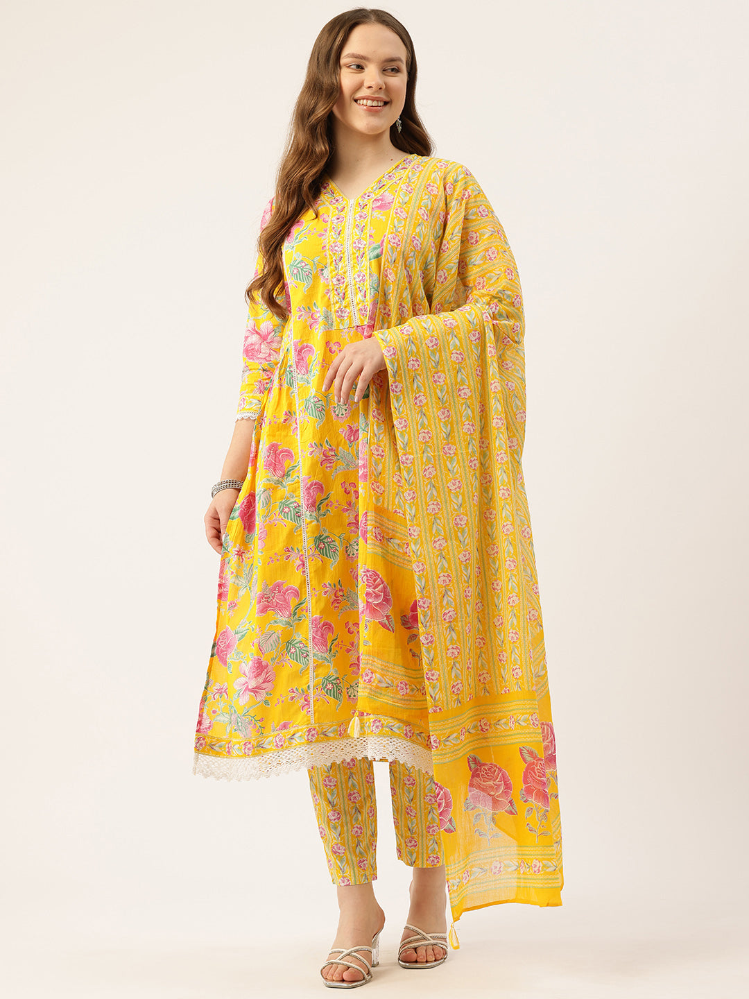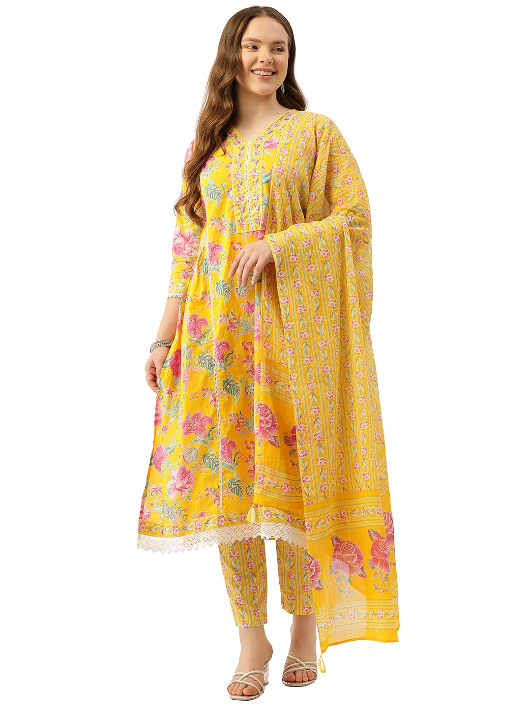 A-line Dupatta Sets - V-Neck, 3/4 Sleeves, Lace Work, Elastic Waistband Pants with Pockets & Full-Length Dupatta (M-XXL)