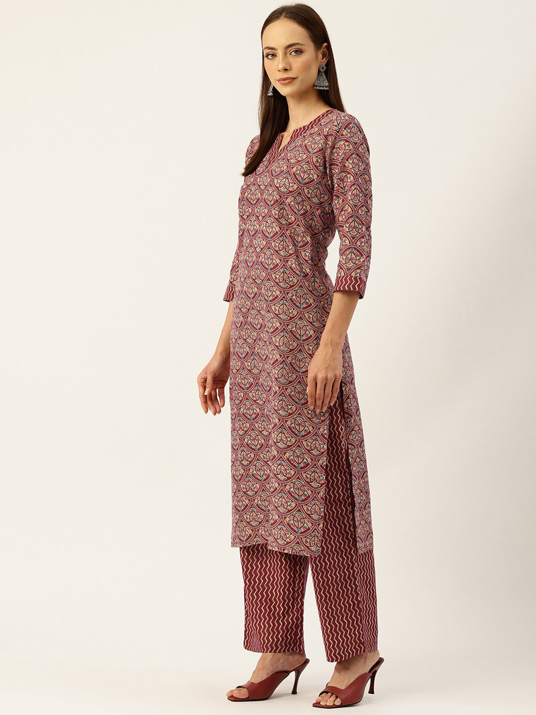 Round V-Cut Neck 3-Piece Kurta Set with Ankle-Length Pants & Full-Length Dupatta (Size S-XXL).