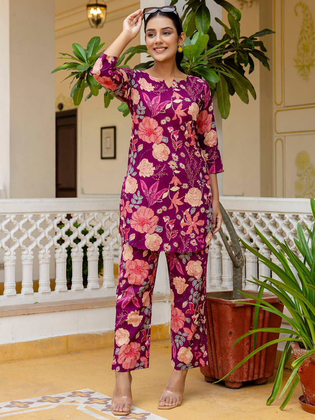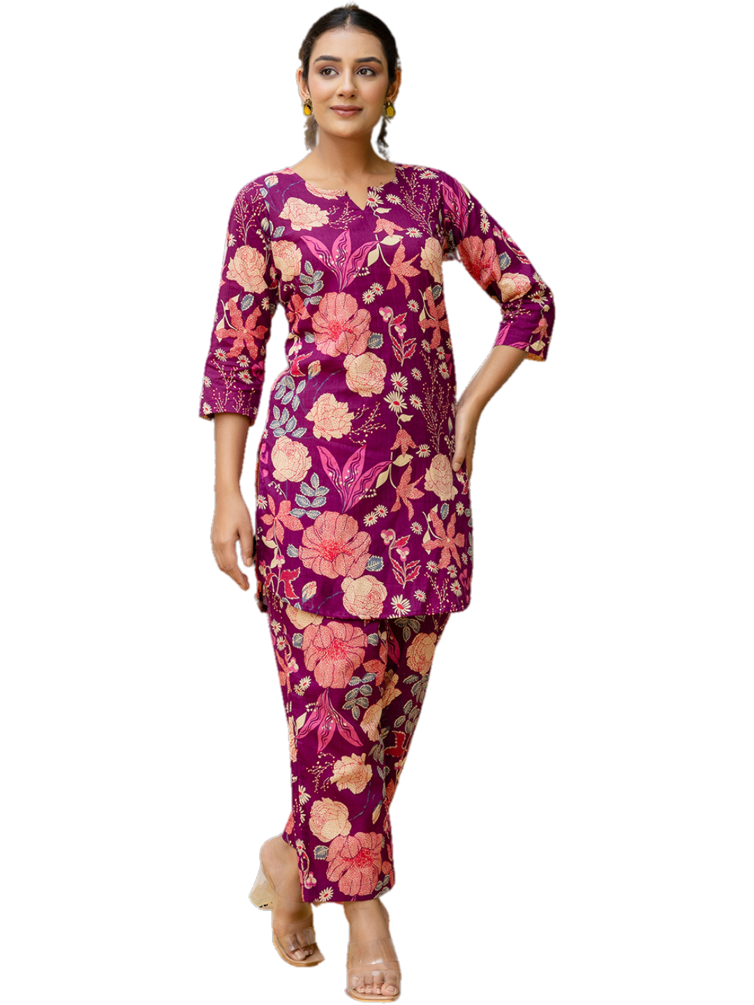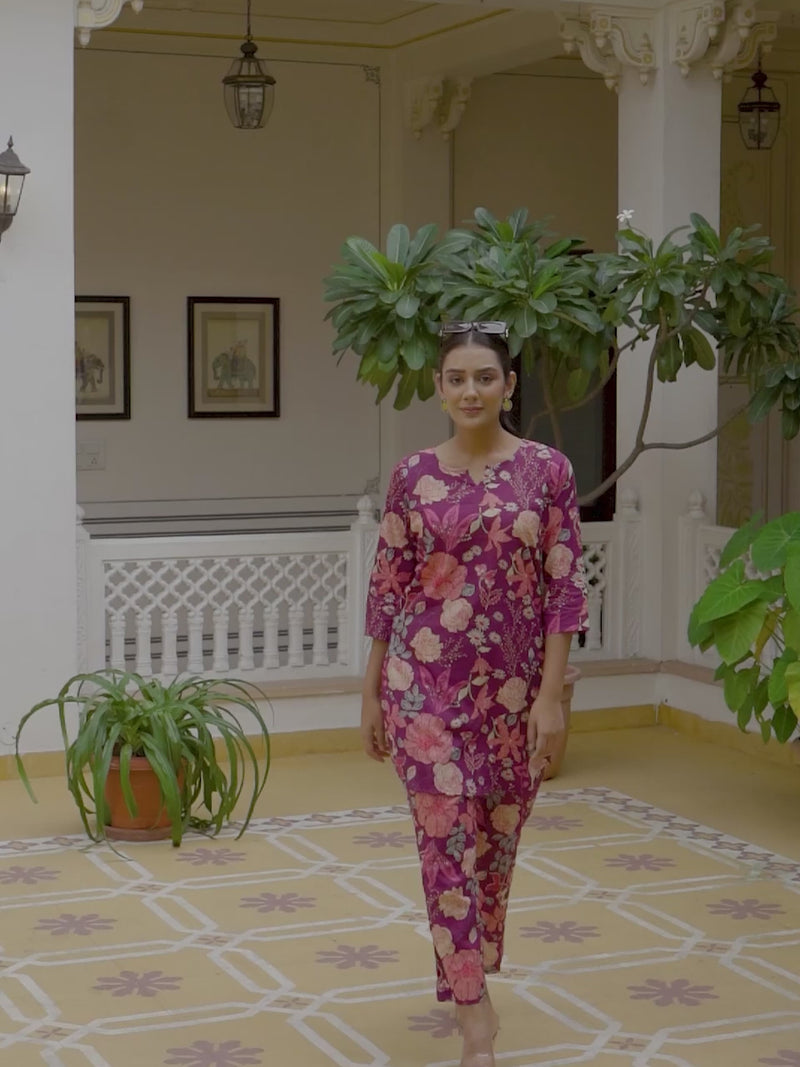 Crafted from pure cotton, this set features a beautifully tailored short kurti with a flattering V-neckline and 3/4 sleeves, enhanced by delicate prints that bring a vibrant yet refined touch to your look. Crafted from soft and breathable cotton fabric, it offers a lightweight and airy feel, ensuring comfort from morning to evening.Designed with a coordinated top and matching bottoms, this set features a relaxed silhouette for effortless movement and a flattering fit. The stylish printed pattern enhances its charm, making it perfect for casual outings, office wear, travel, or everyday home wear.