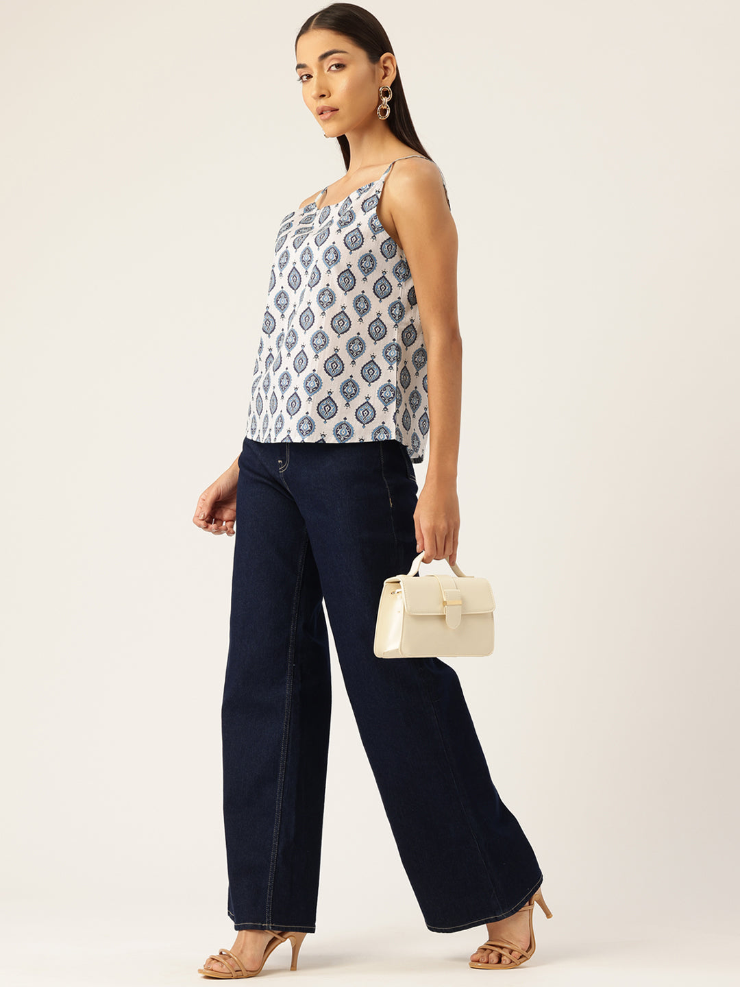 Relaxed fit strappy sleeveless top digitally printed on linen fabric. | Size- Small | Colour - White, Blue