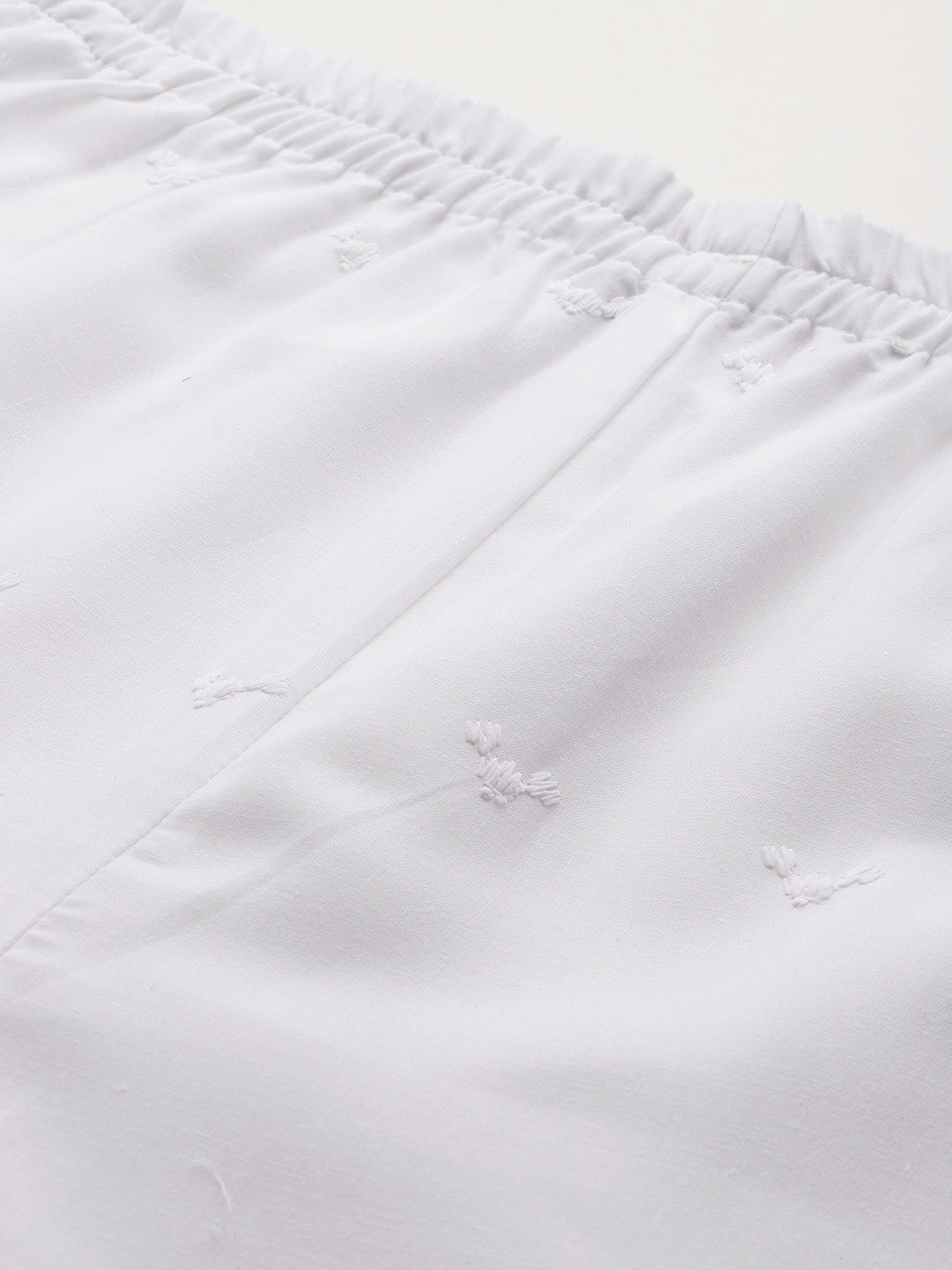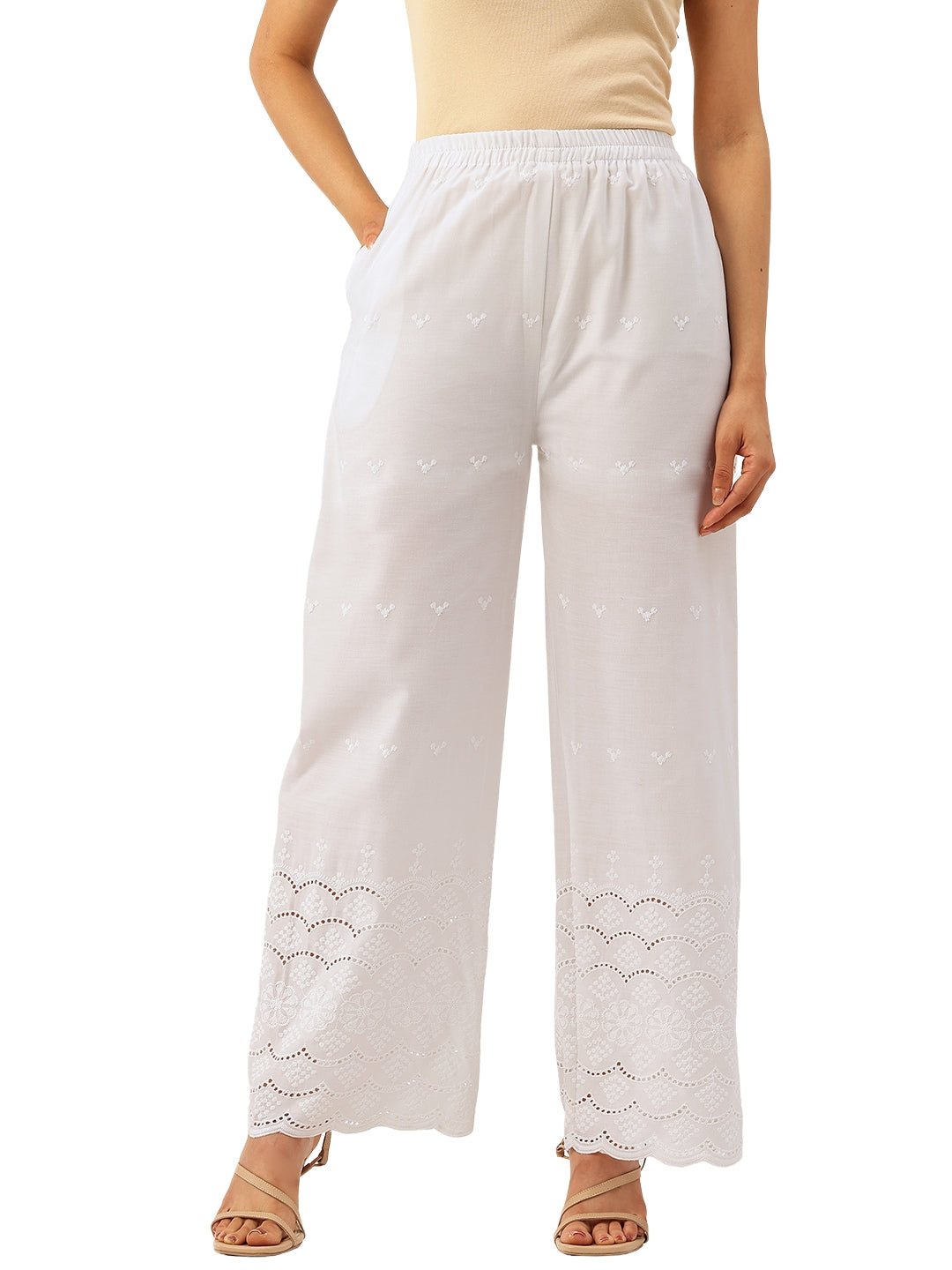 Elevate your everyday style with our White Embroidered Palazzos, designed for both elegance and comfort.Crafted from soft, breathable fabric, they feature a smooth inner lining for added ease and coverage. Crafted with a fully lined fabric, they provide proper coverage and a smooth, comfortable feel for all-day wear. The delicate embroidery enhances the overall look, adding a touch of sophistication suitable for both casual and festive occasions.Designed with an elastic waistband for a flexible and secure fit, these ankle-length palazzos ensure ease of movement. The side pocket offers added convenience, making them a practical and stylish choice for pairing with kurtis, tunics, or festive tops.