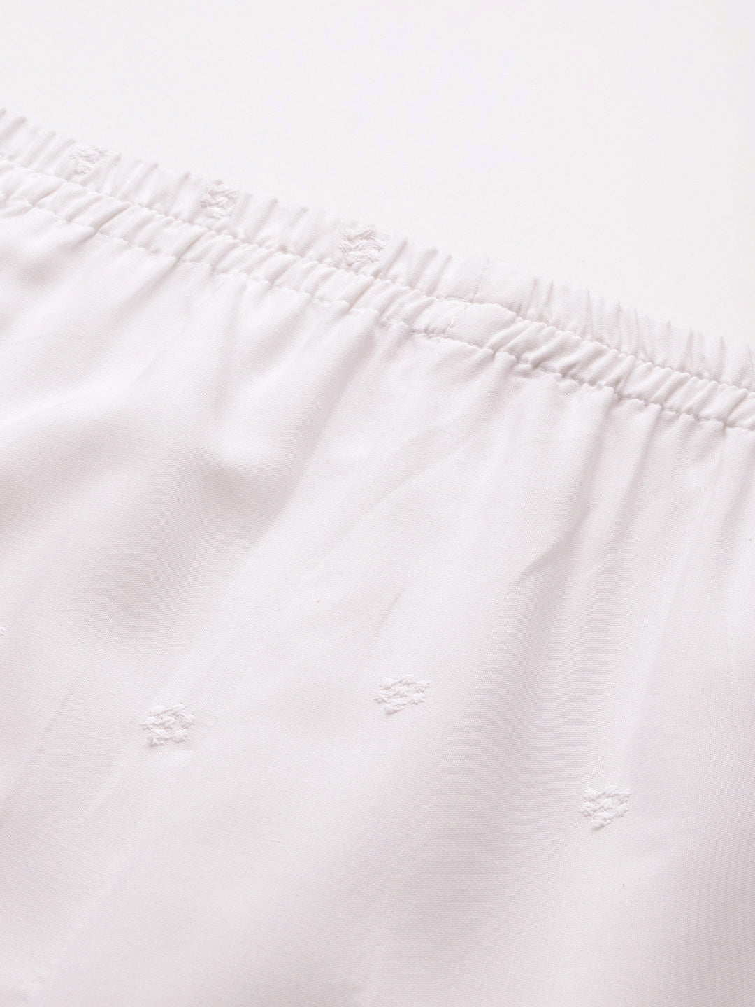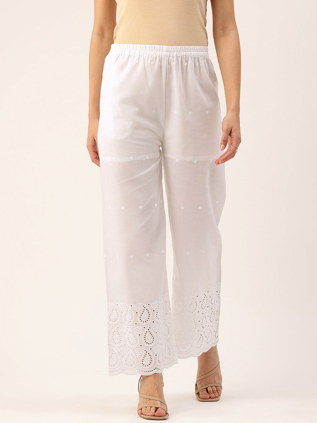 Elevate your everyday style with our White Embroidered Palazzos, designed for both elegance and comfort.Crafted from soft, breathable fabric, they feature a smooth inner lining for added ease and coverage. Designed with a fully lined interior, they offer proper coverage and a soft, comfortable feel throughout the day. The subtle embroidery enhances the overall look, giving it a refined ethnic appeal. The elastic waistband ensures a flexible and secure fit, while the ankle-length cut provides a clean and stylish finish. Featuring a practical side pocket, these palazzos combine comfort and functionality, making them ideal for casual, office, or festive wear.