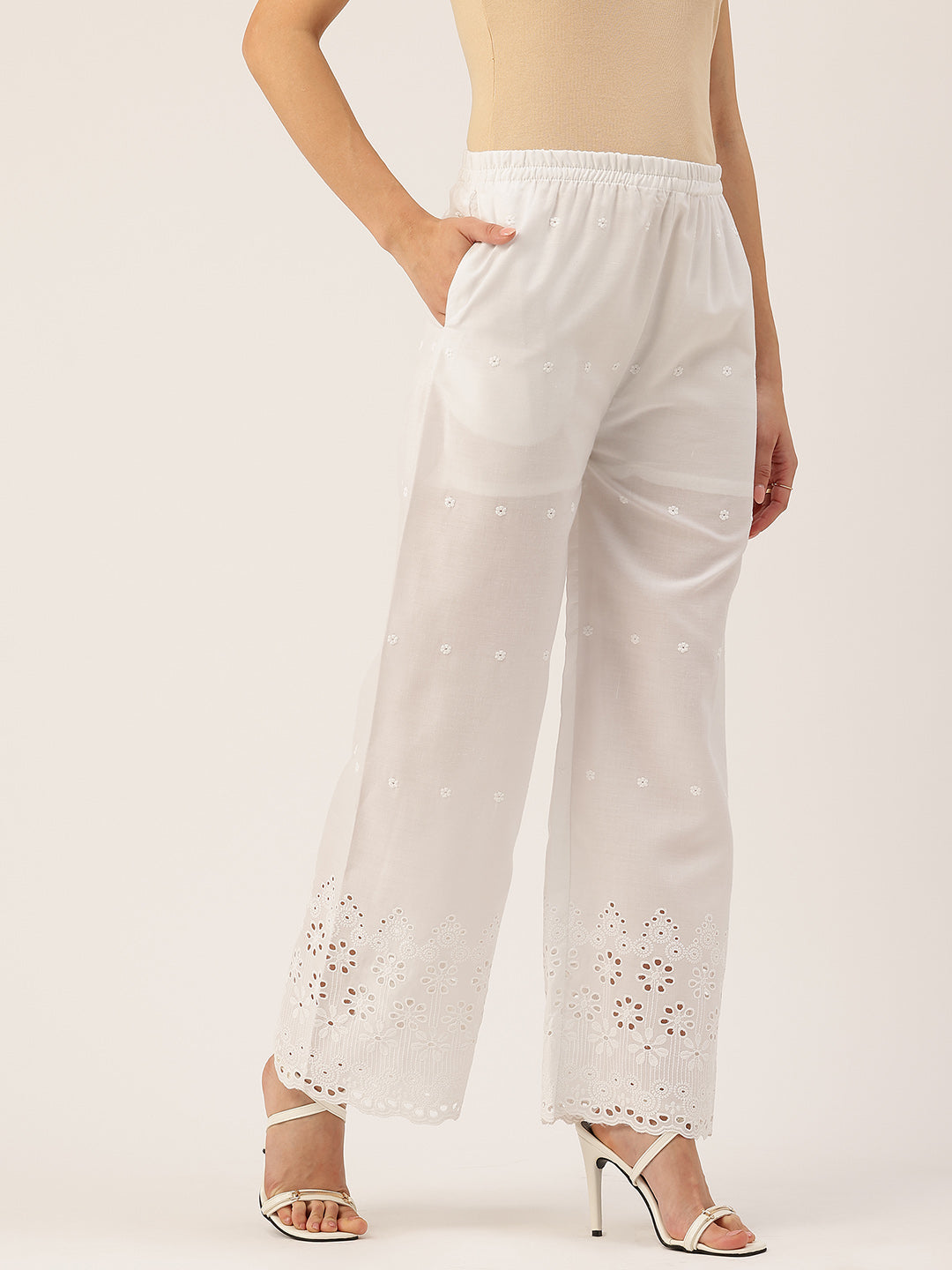 Elevate your everyday style with our White Embroidered Palazzos, designed for both elegance and comfort.Crafted from soft, breathable fabric, they feature a smooth inner lining for added ease and coverage. Made with a fully lined fabric, they ensure proper coverage and a smooth, comfortable feel for everyday use. The elegant embroidery adds a graceful and refined touch, making them suitable for both casual outings and festive occasions.The elastic waistband provides a flexible and comfortable fit, while the ankle-length design gives a neat and modern appearance. A practical side pocket adds convenience, making these palazzos both functional and fashionable.