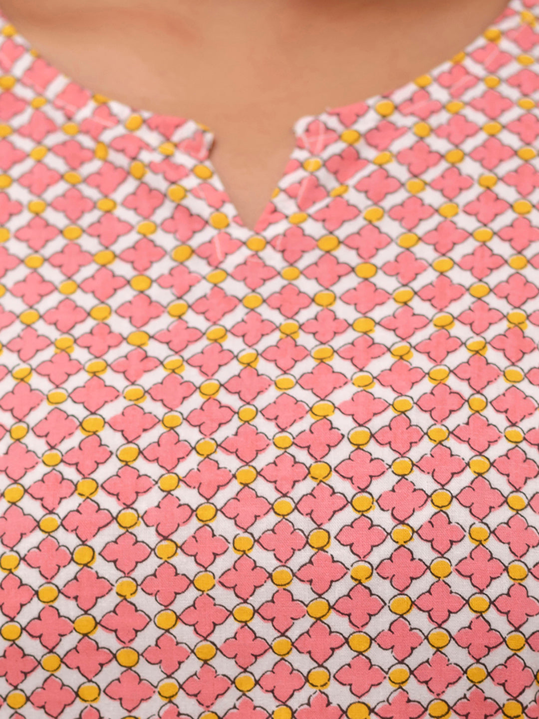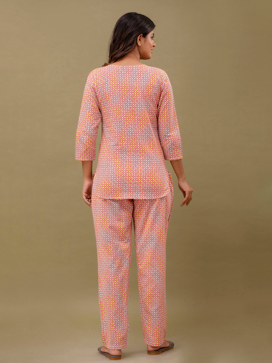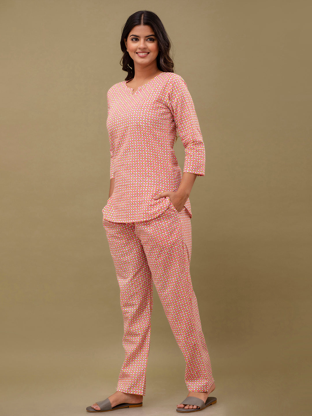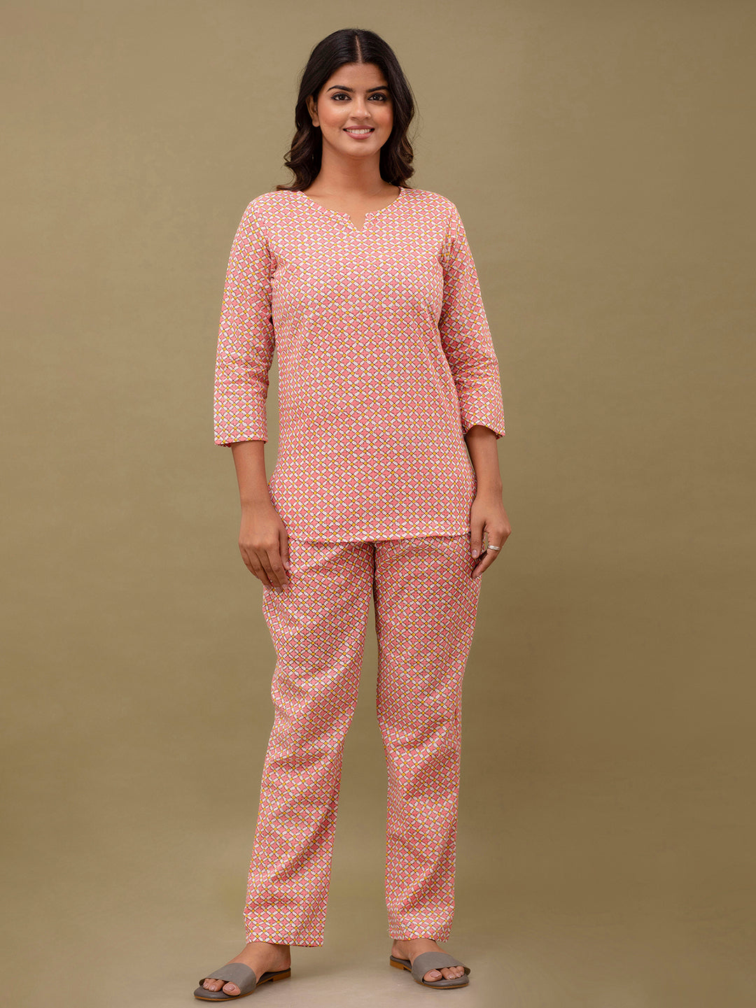 Elevate your everyday style with our Printed Cotton Co-Ord Set, thoughtfully designed for comfort and effortless elegance. This set features a beautifully printed short kurti with a flattering V-neckline and graceful 3/4 sleeves, offering a refined yet relaxed look. Crafted from soft and breathable cotton fabric, it keeps you comfortable throughout the night and feels gentle on the skin.The V-neck kurti adds a modern and flattering look, while the ankle-length pants offer a relaxed fit for ease of movement. The pretty printed design adds charm and elegance, making it ideal for daily nightwear and lounging.
