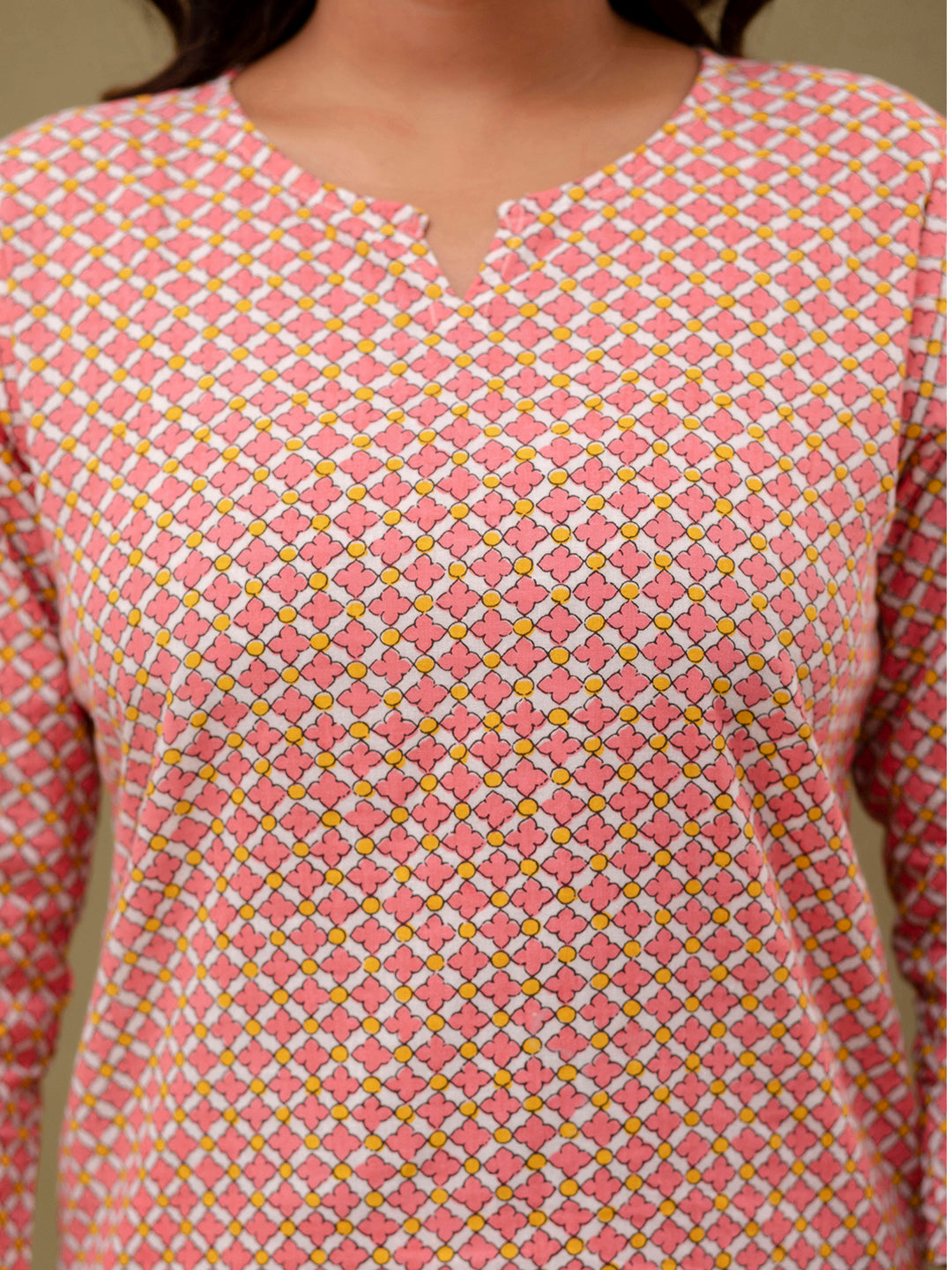 • Soft & Breathable Cotton Fabric• Elegant Pink Color with Printed Design• Stylish V-Neck Kurti