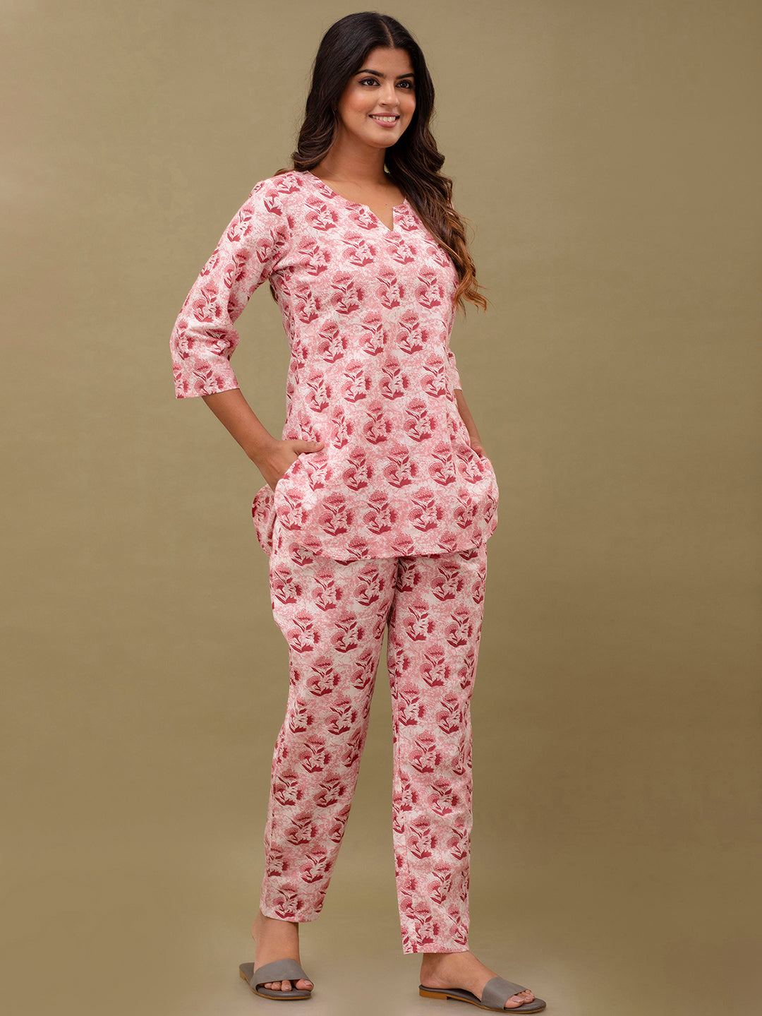 Elevate your everyday style with our Printed Cotton Co-Ord Set, thoughtfully designed for comfort and effortless elegance. This set features a beautifully printed short kurti with a flattering V-neckline and graceful 3/4 sleeves, offering a refined yet relaxed look. Made from soft and breathable cotton fabric, it ensures comfort and a gentle feel on the skin, making it perfect for sleep and home lounging.The V-neck kurti adds a modern and flattering style, while the ankle-length pants provide a relaxed fit for ease of movement. The attractive printed design enhances its overall appeal, making it an ideal choice for everyday nightwear.
