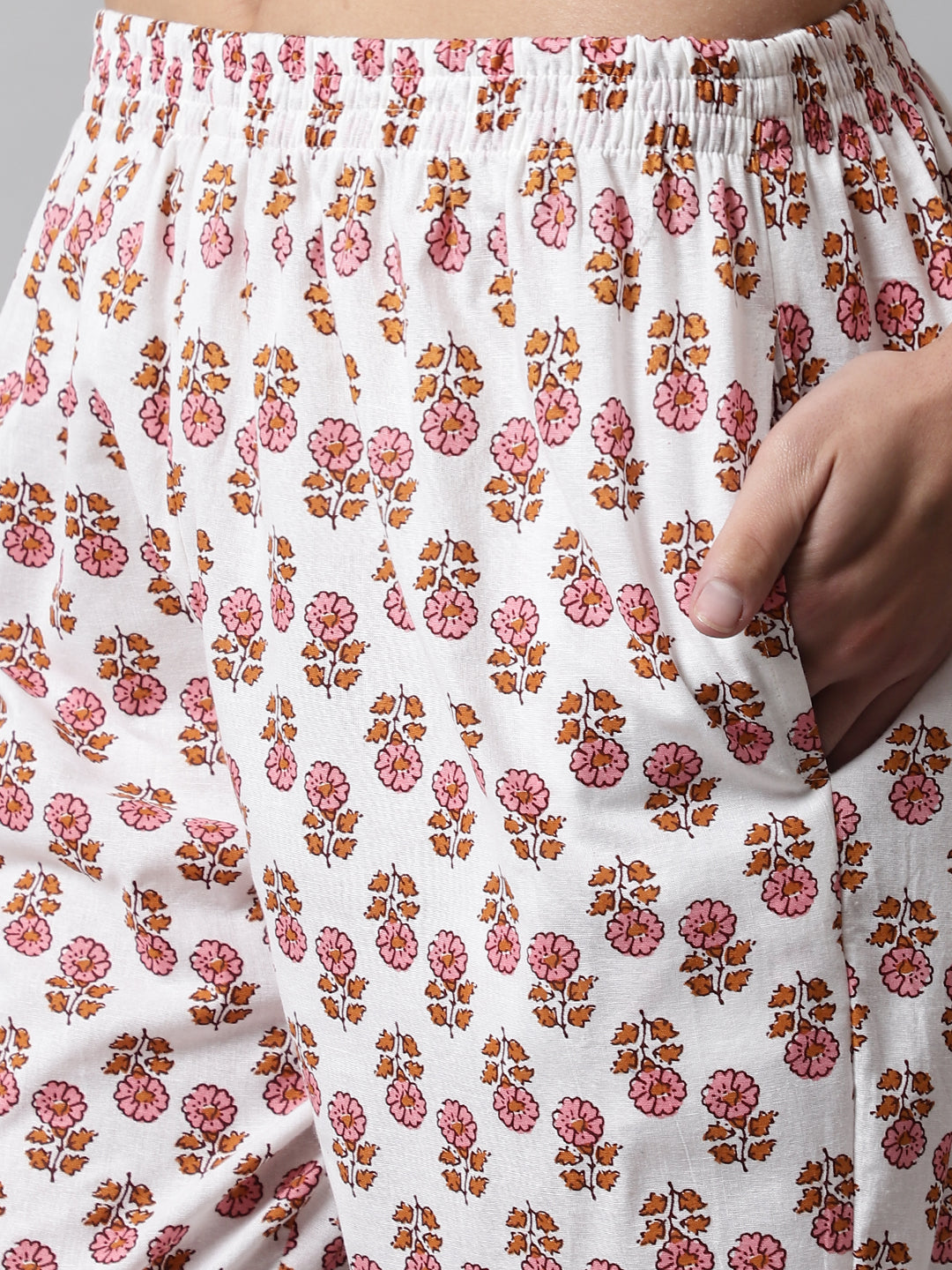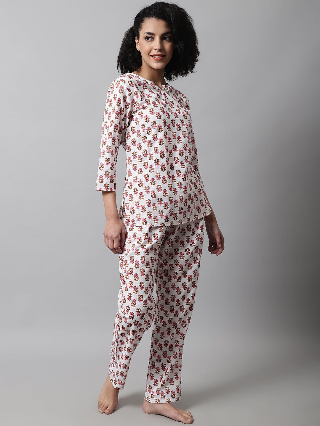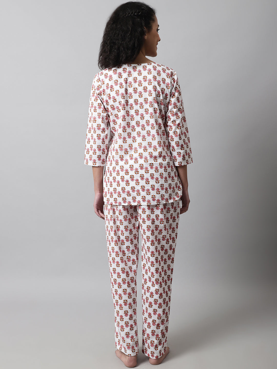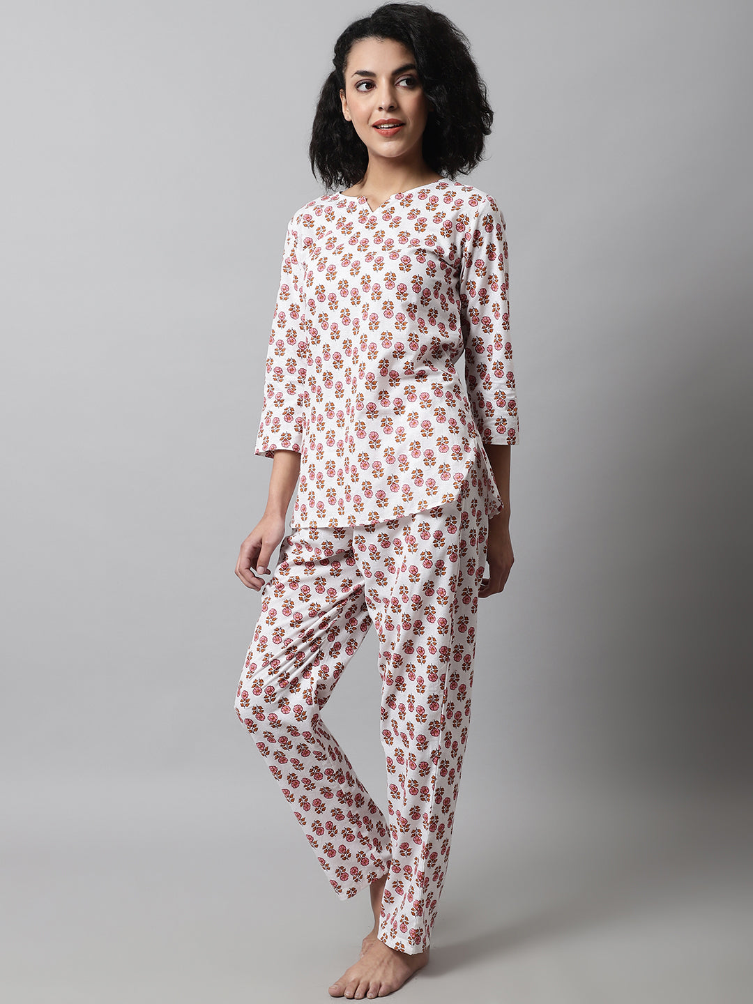 White Printed Cotton Night Suit with V-Neck Kurti & Ankle-Length Pants