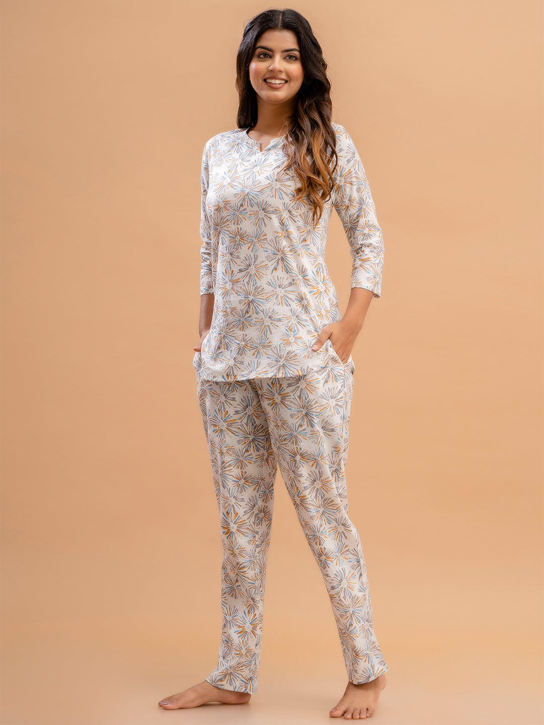 Elevate your everyday style with our Printed Cotton Co-Ord Set, thoughtfully designed for comfort and effortless elegance. This set features a beautifully printed short kurti with a flattering V-neckline and graceful 3/4 sleeves, offering a refined yet relaxed look. Made from soft and breathable cotton fabric, it keeps you cool and comfortable throughout the night.The stylish V-neck kurti adds a modern touch, while the ankle-length pants provide a relaxed and easy fit. The elegant printed design enhances the overall look, making it perfect for daily nightwear and loungewear.
