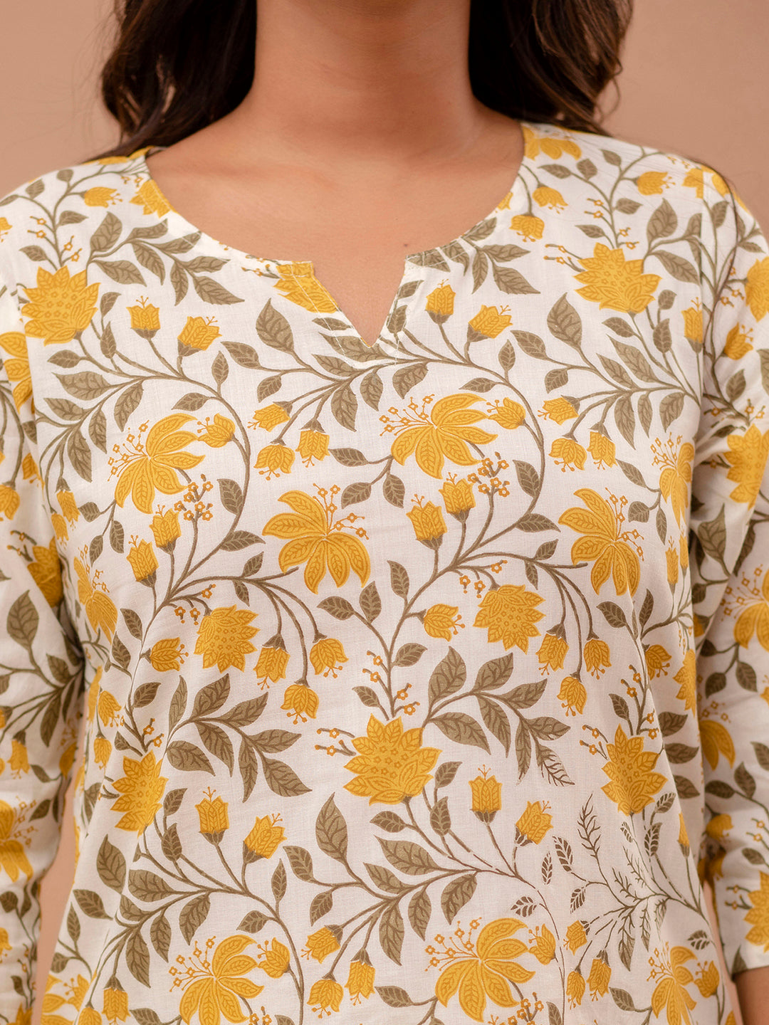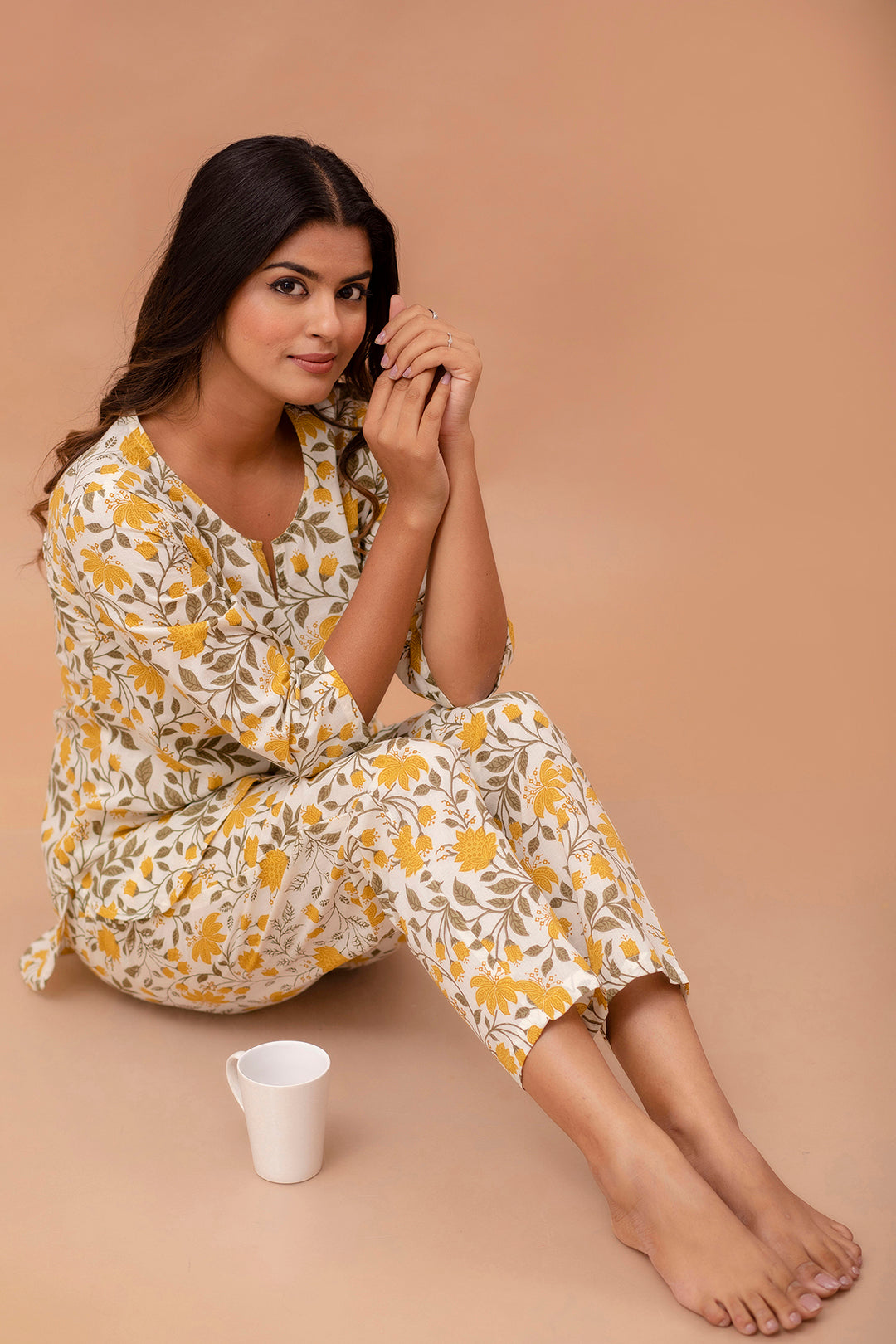 Elevate your everyday style with our Printed Cotton Co-Ord Set, thoughtfully designed for comfort and effortless elegance. This set features a beautifully printed short kurti with a flattering V-neckline and graceful 3/4 sleeves, offering a refined yet relaxed look. Made from soft and breathable cotton fabric, it feels gentle on the skin while keeping you relaxed throughout the night.The V-neck kurti adds a modern and flattering touch, and the ankle-length pants offer a relaxed fit for easy movement. The elegant printed design makes it perfect for everyday nightwear and home lounging.