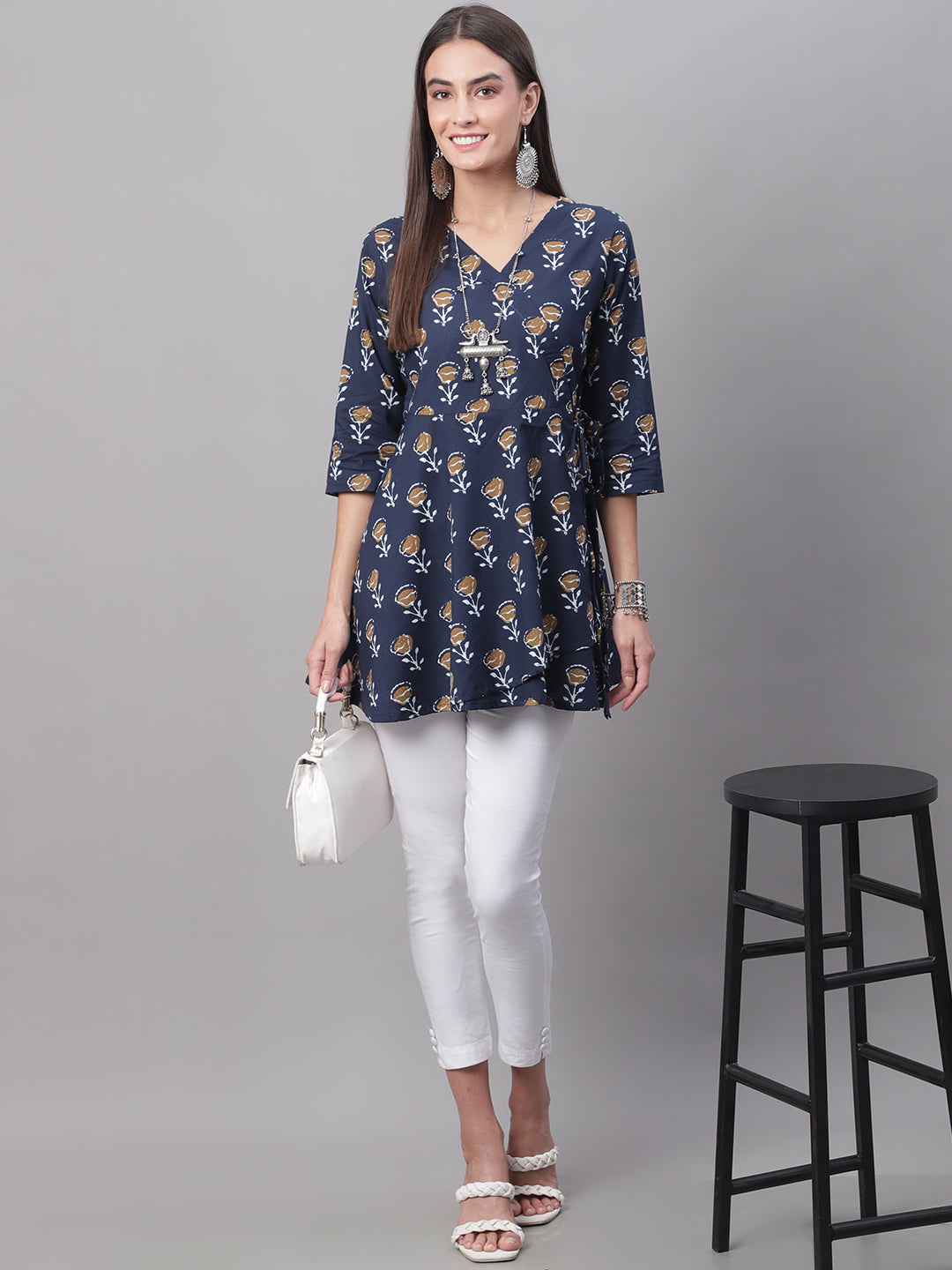 Made from pure cotton, it ensures all-day comfort and breathability. The ethnic motif print, V-neck design, and flared hemline create a relaxed yet graceful look, ideal for casual outings.