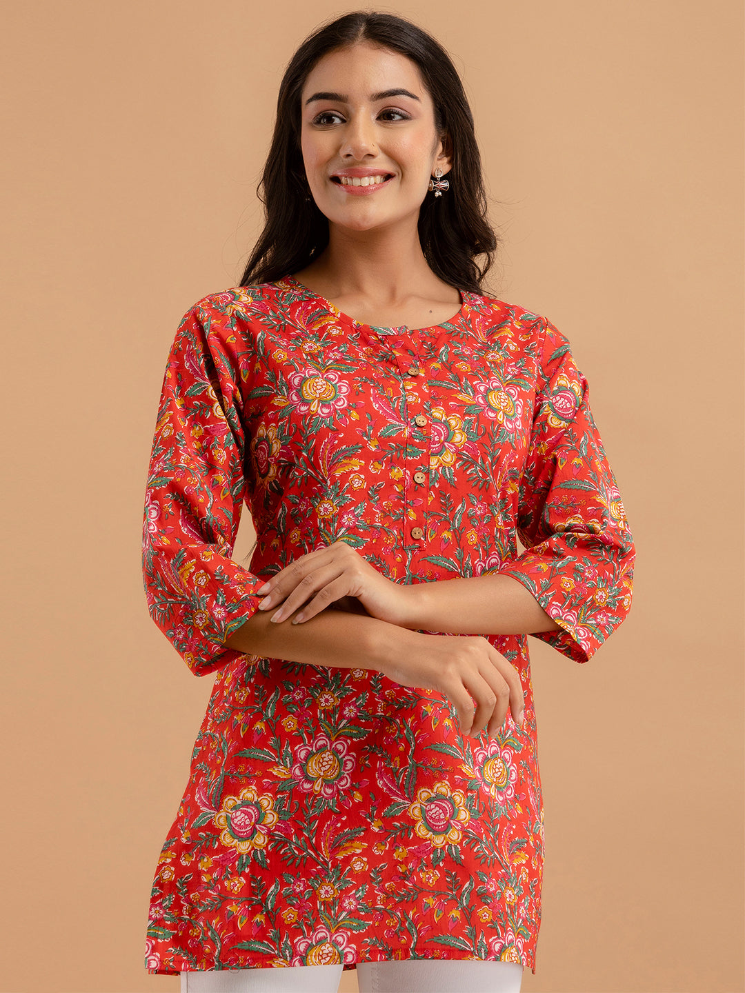 Made from pure cotton, it ensures comfort and breathability throughout the day. The floral print brings a feminine charm, complemented by a classic round neck and three-quarter sleeves. The straight hemline allows easy pairing with leggings, jeans, or trousers for a stylish casual look.