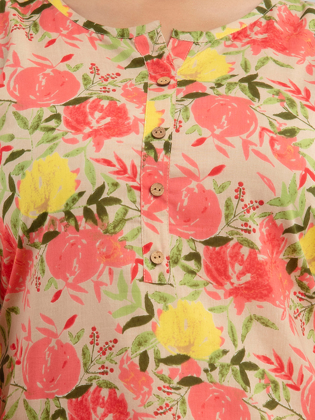 Made from pure cotton fabric, it feels light, breathable, and comfortable for all-day use. The subtle floral print gives it a graceful look, while the round neck and three-quarter sleeves keep the design simple and versatile. Finished with a straight hemline, this kurti is easy to pair with leggings, jeans, or trousers for a neat everyday outfit.