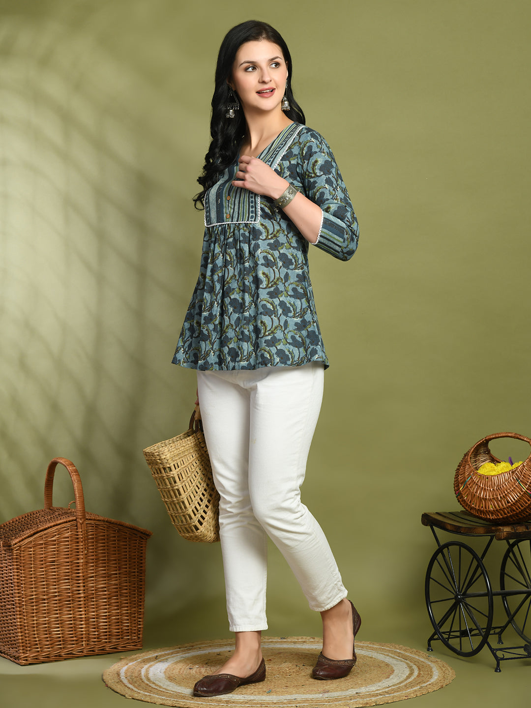 Featuring a stylish V-neckline, regular sleeves, and graceful side slits, it falls at hip length with a flared hemline that adds flow and movement. Crafted with a regular machine weave, this kurti pairs beautifully with jeans, leggings, or trousers—perfect for casual outings and daily wear.