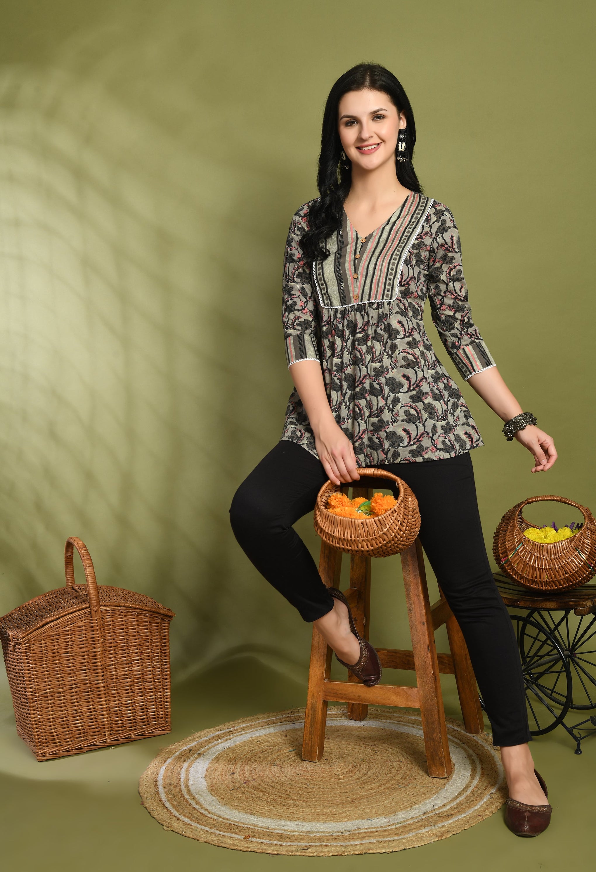 Styled with a flattering V-neckline and regular sleeves, it ensures both comfort and ease of wear. The hip-length design with side slits and a flared hemline adds movement and a modern touch. Crafted using regular machine weave, this kurti pairs effortlessly with jeans, leggings, or trousers for casual outings.