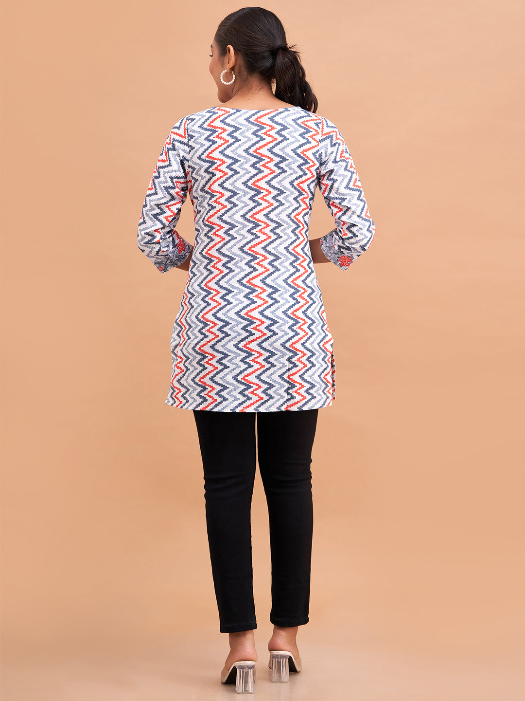 The elegant floral block print adds a classic ethnic touch, while the round neck and three-quarter regular sleeves ensure a comfortable and versatile fit. Featuring a straight hemline, this kurti is easy to pair with jeans, leggings, or palazzos, making it perfect for daily wear. Easy to care for with machine wash convenience.