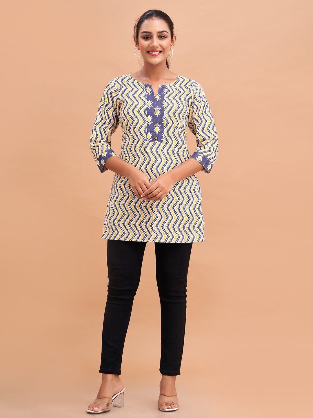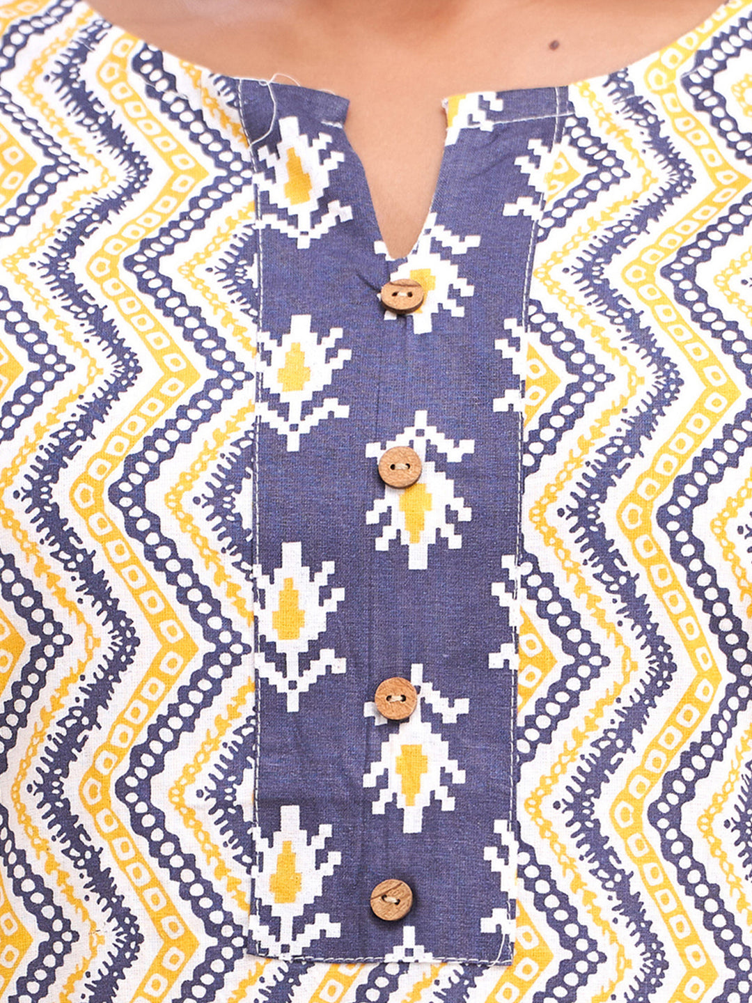 Made from soft, breathable pure cotton with a regular weave, it keeps you comfortable all day. The elegant floral block print brings a timeless traditional charm, while the round neck and three-quarter regular sleeves offer a classic, easy-to-wear silhouette. Finished with a straight hemline, this kurti pairs perfectly with jeans, leggings, or palazzos. Easy to maintain with machine wash care.