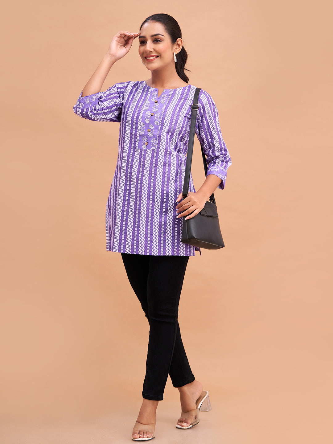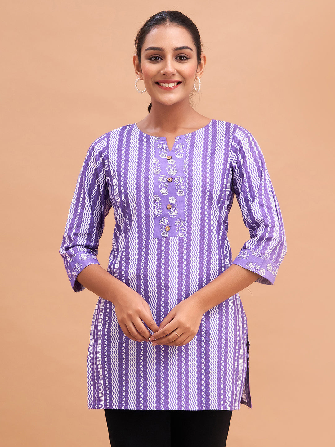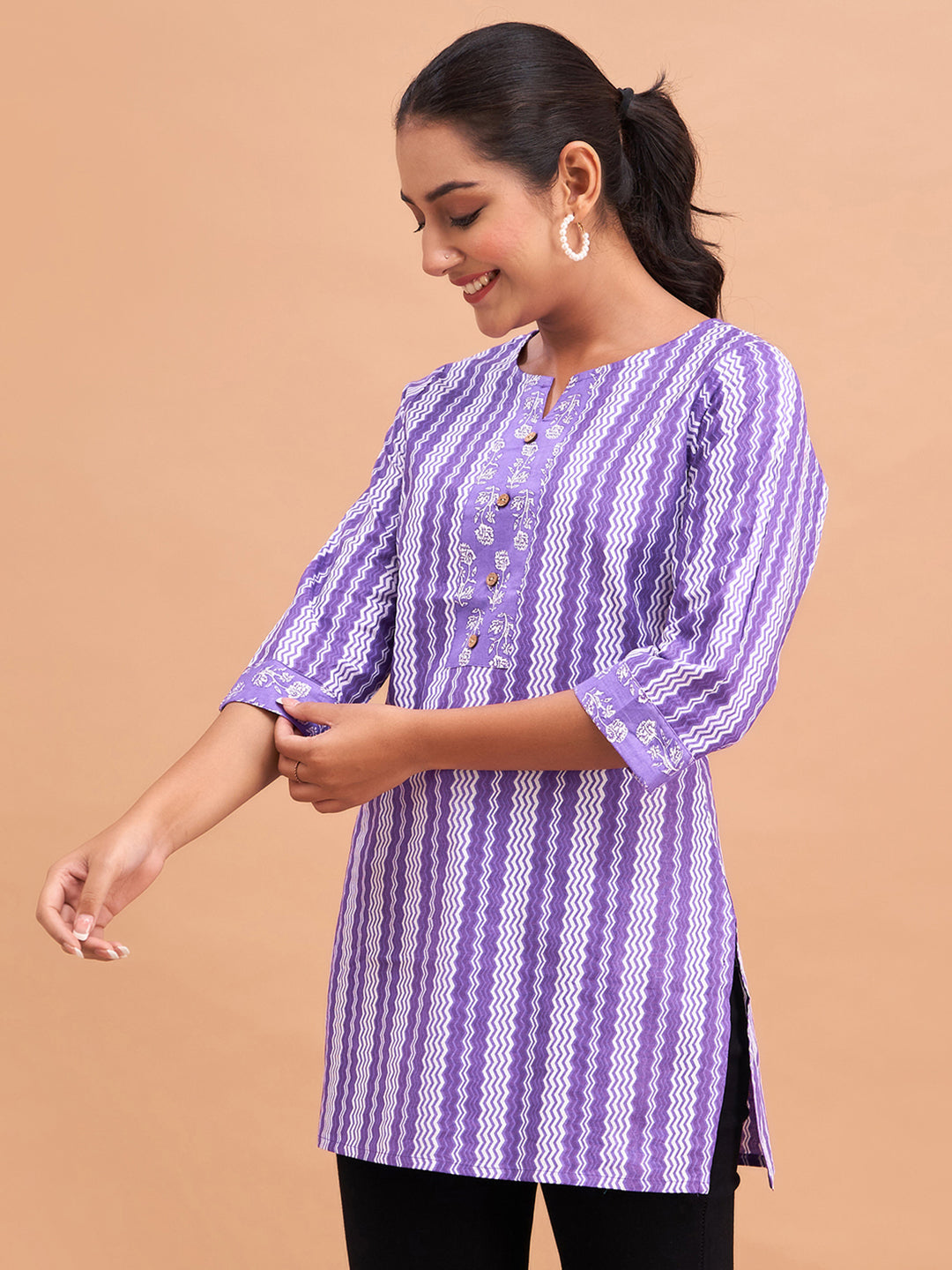 Crafted from soft, breathable pure cotton with a regular weave pattern, it offers lasting comfort for everyday wear. The graceful floral block print adds a traditional touch, while the round neck and three-quarter regular sleeves provide a classic and easy fit. Designed with a straight hemline, this kurti pairs well with jeans, leggings, or palazzos. Easy to care for, it can be conveniently machine washed.
