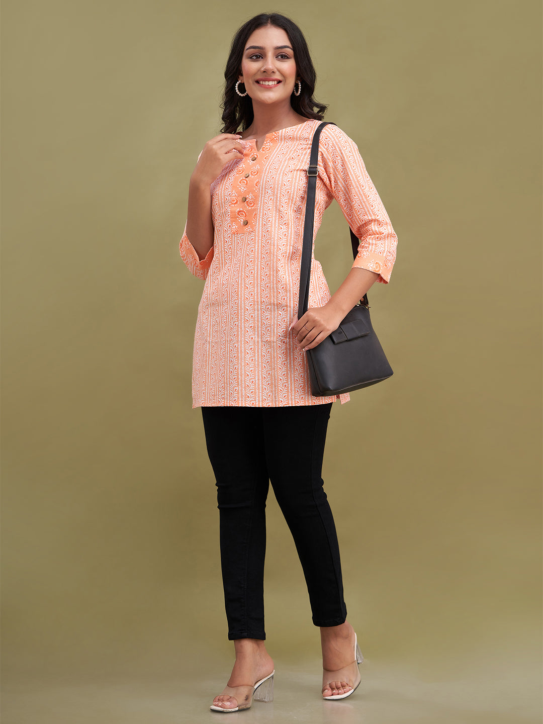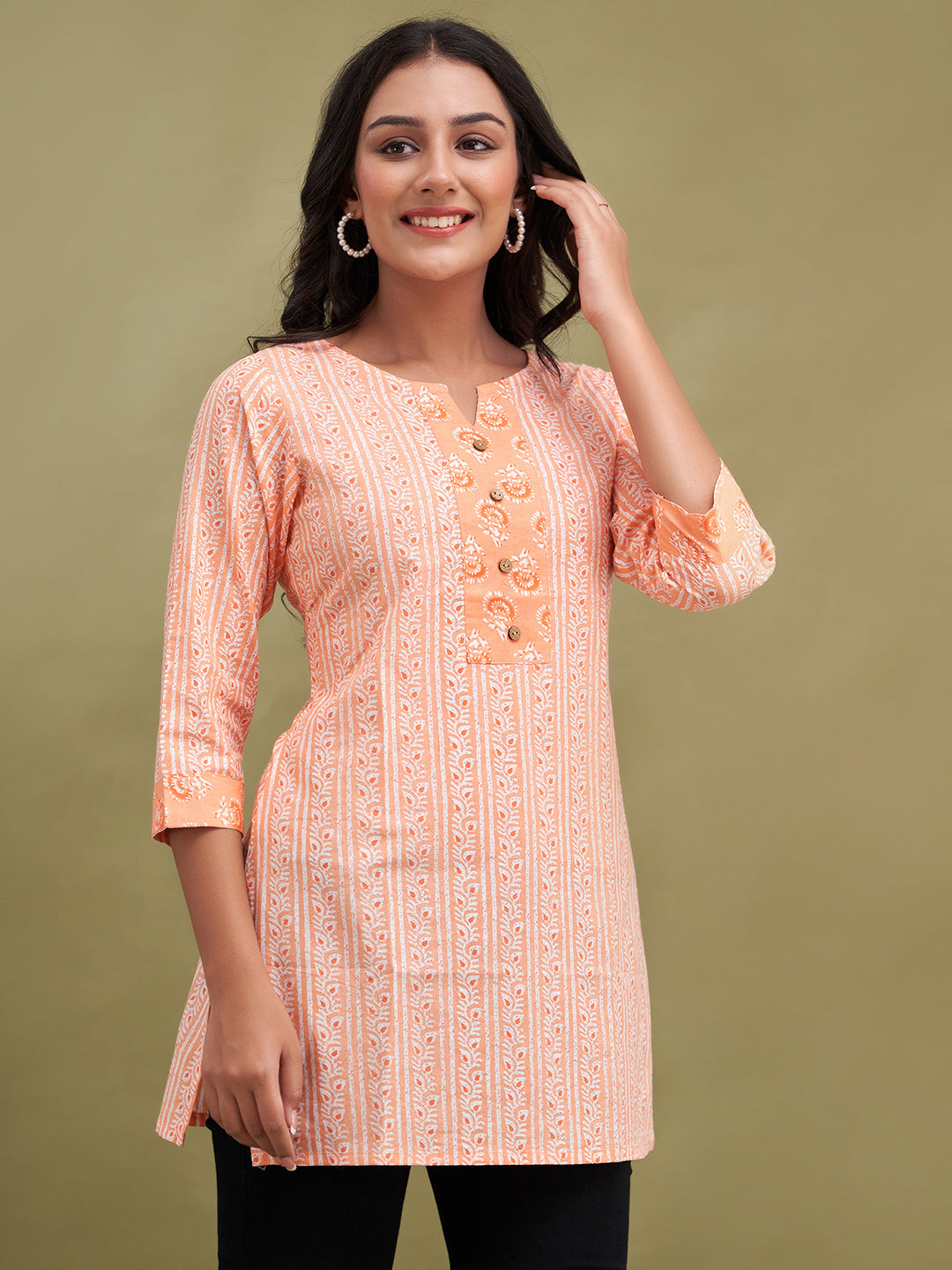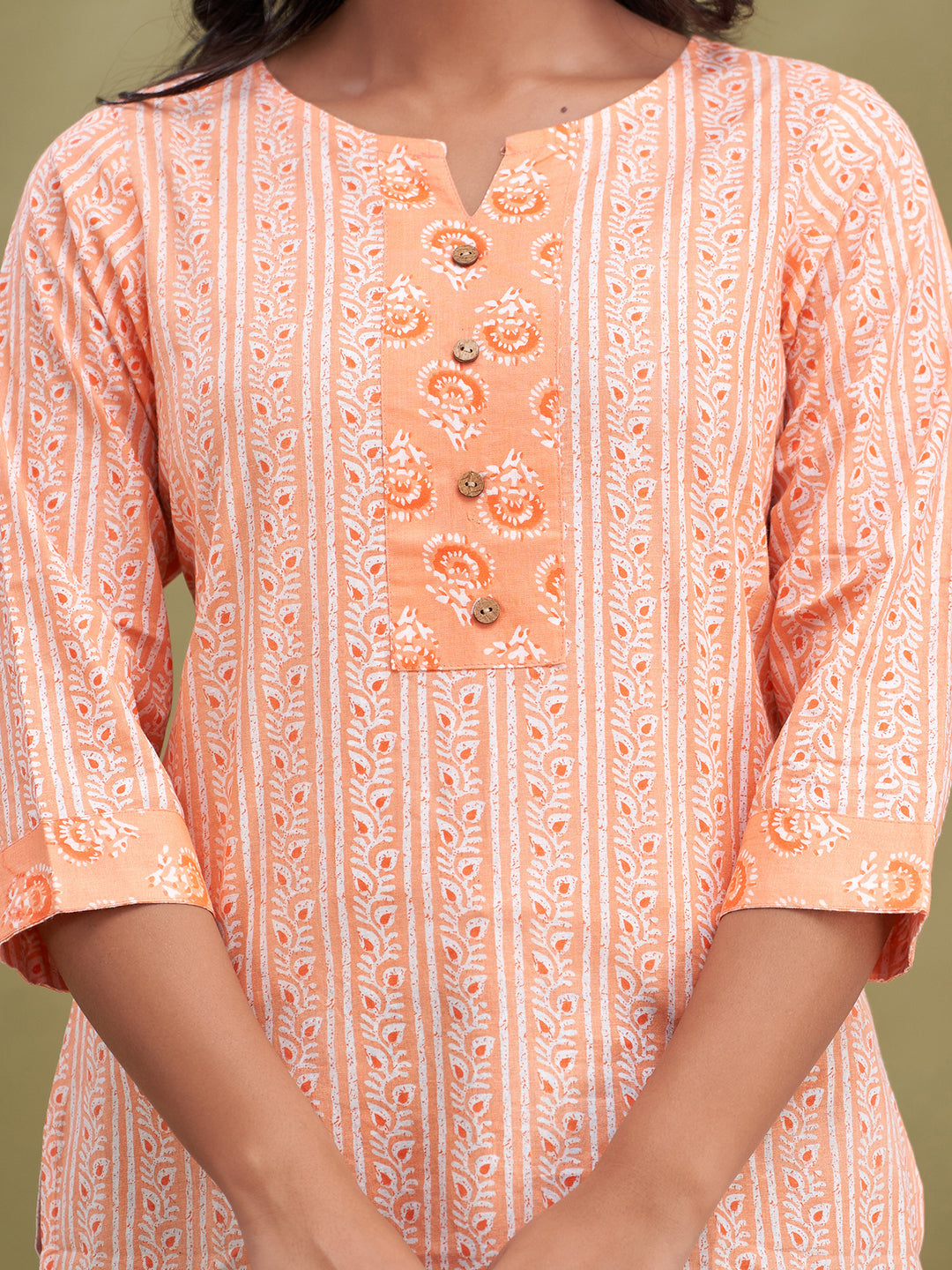 Made from soft, breathable pure cotton with a regular weave pattern, it ensures all-day ease and durability. The elegant floral block print gives it a timeless traditional appeal, while the round neck and three-quarter regular sleeves provide a classic and comfortable fit. Designed with a straight hemline, this kurti pairs effortlessly with jeans, leggings, or palazzos. Easy to maintain with machine wash care, it’s perfect for everyday use.