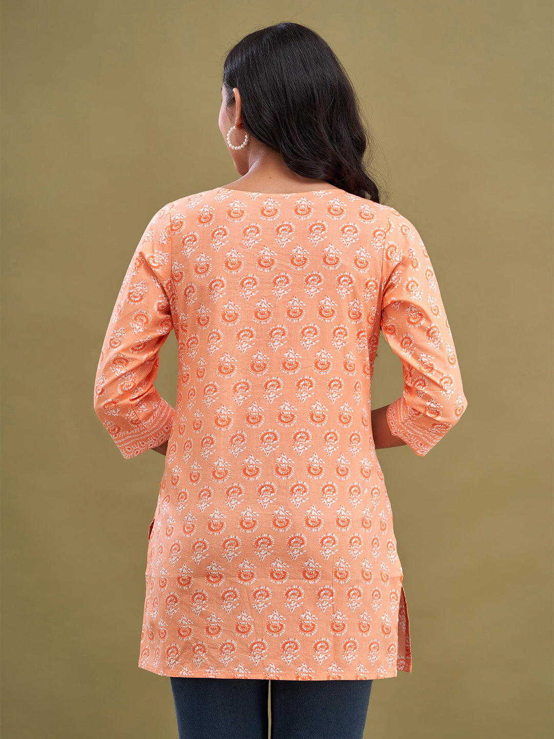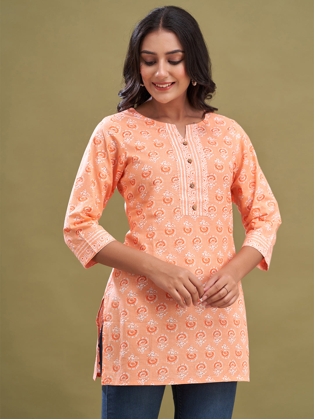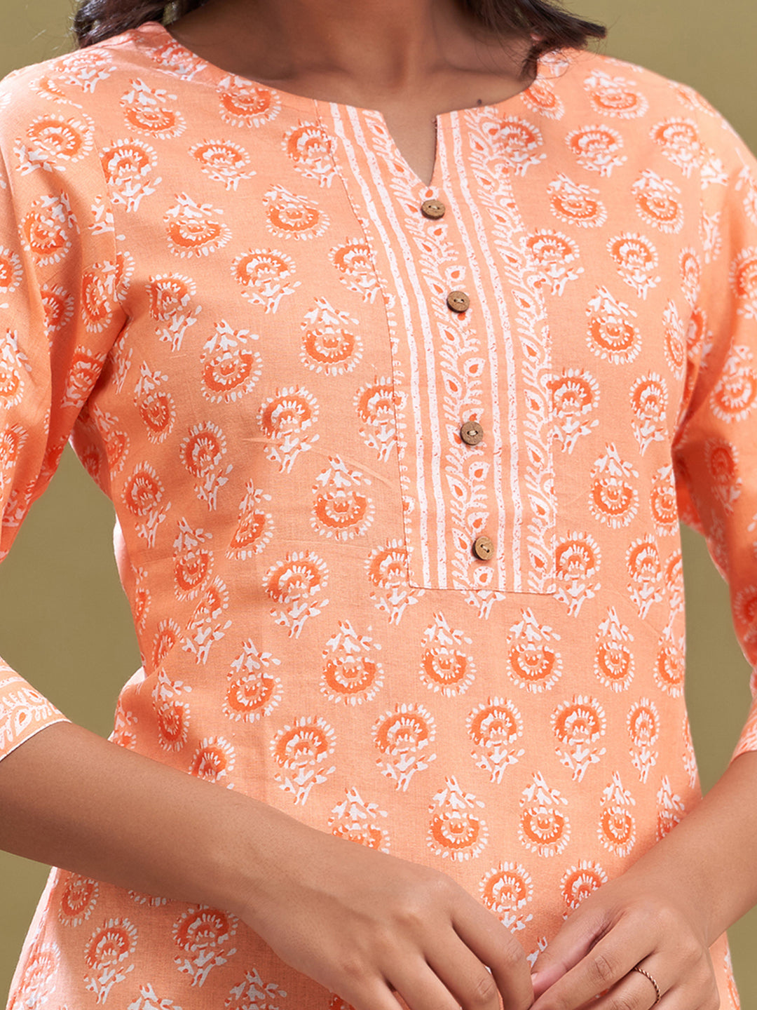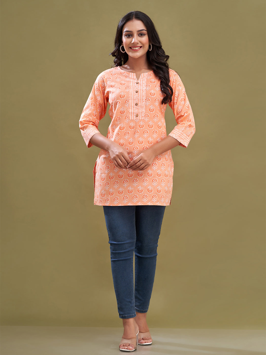 Crafted from soft, breathable pure cotton with a regular weave pattern, it is perfect for everyday wear. The elegant floral block print adds a traditional touch, while the round neck and three-quarter regular sleeves ensure a classic and comfortable fit. Finished with a straight hemline, this kurti pairs easily with jeans, leggings, or palazzos. Easy to maintain with machine wash care.