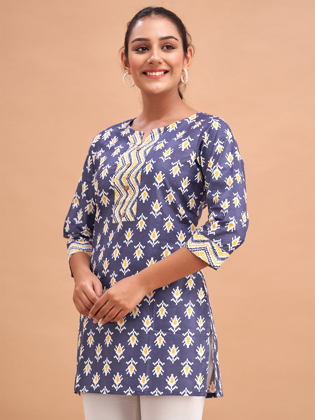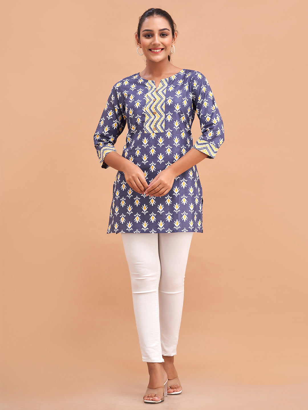 Crafted from soft, breathable cotton with a durable machine weave, it offers comfort for all-day wear. The charming floral print and subtle gathers add a graceful touch, while the round neck and three-quarter sleeves provide a classic, versatile style. Perfect for daily wear, casual outings, or meetups. Easy to maintain with machine wash care.