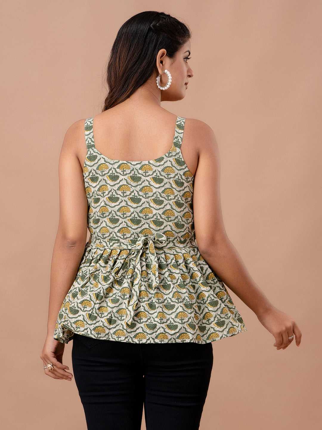Made from soft and breathable cotton fabric with a sturdy machine weave, it offers all-day comfort. The ethnic floral print adds a stylish touch, while the round neckline and sleeveless design keep the look light and modern. Gathers enhance the peplum silhouette, giving a flattering and feminine fit—perfect for everyday wear and casual outings.
