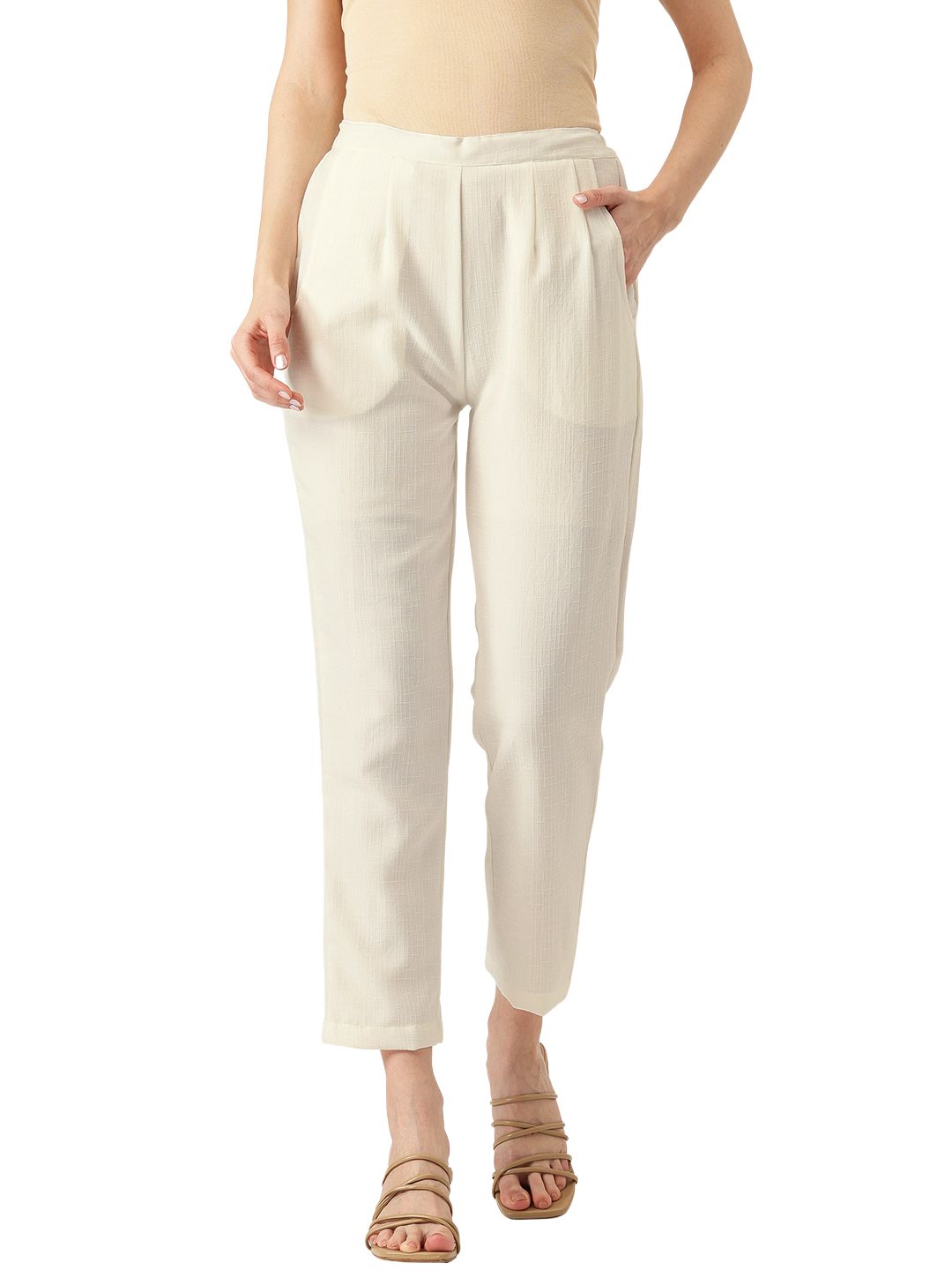 Cream Linen Trouser - Ankle-Length Pant , Partially Elasticated ,Double Pockets