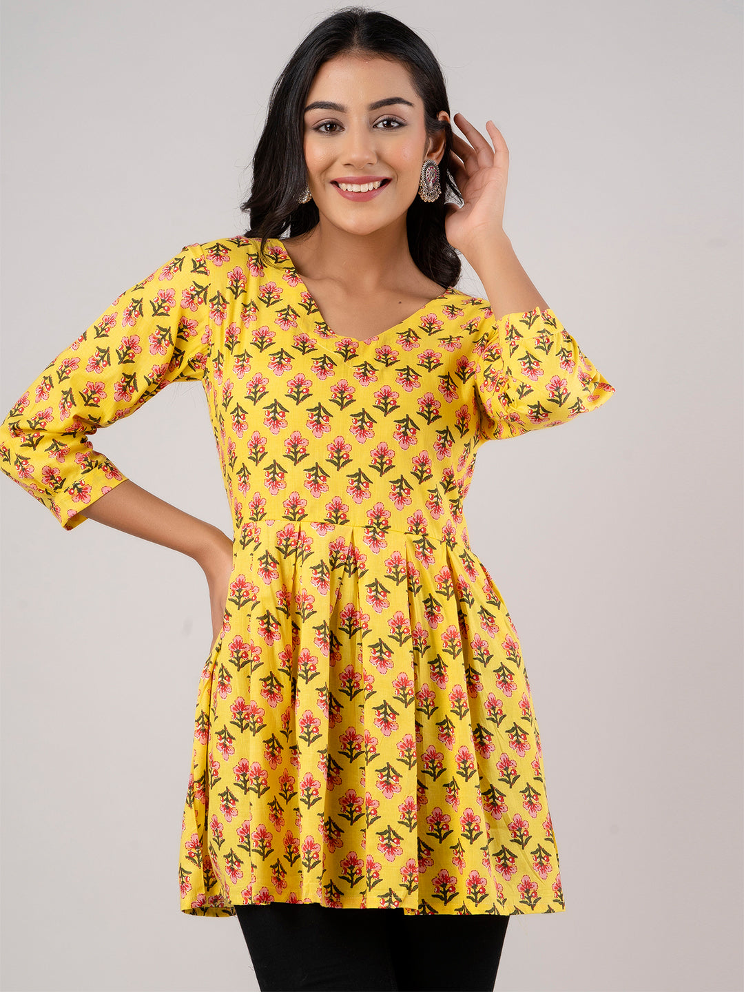 Crafted from pure cotton fabric, it offers a soft, breathable feel that keeps you comfortable all day long. The cheerful floral print adds a festive vibe, while the peplum-style flared hemline enhances the overall silhouette with a graceful and feminine touch. Featuring a stylish V-neck and three-quarter puff sleeves, this tunic blends traditional charm with modern elegance. Pair it with leggings, palazzos, or slim-fit pants for a vibrant festive look.