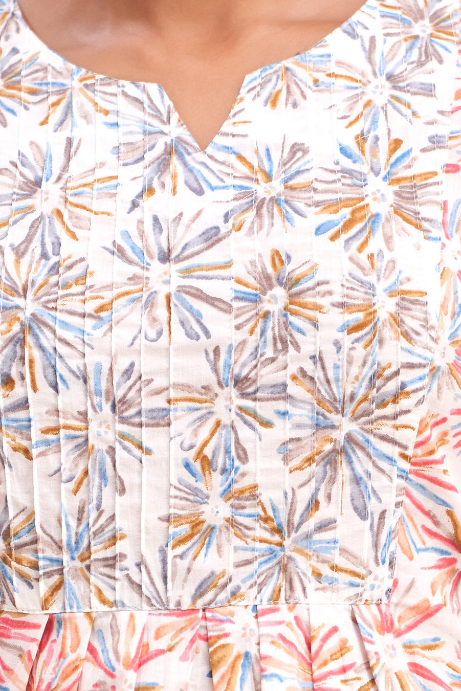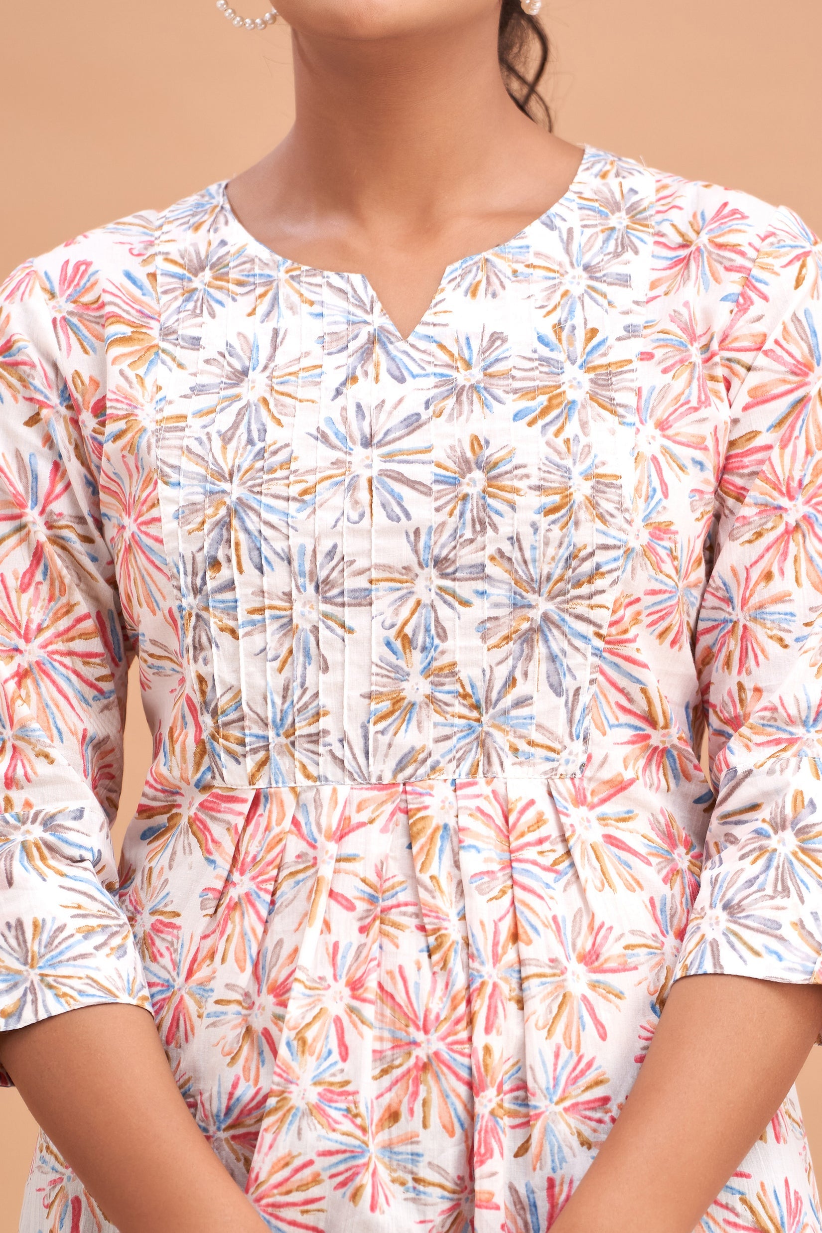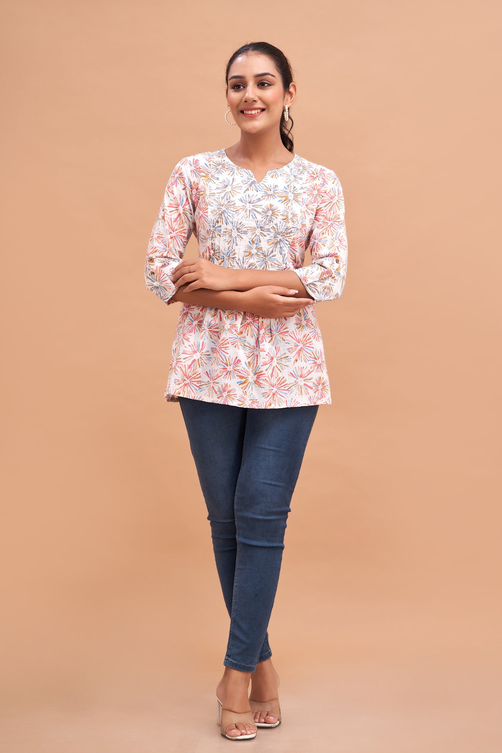 Crafted from soft, breathable cotton with a machine weave, it ensures all-day comfort. The round neckline and three-quarter sleeves create a classic look, while the gathered detailing adds a flared, flattering silhouette. Featuring vibrant ethnic motif prints, this tunic is perfect for casual outings, meet-ups, or everyday wear.