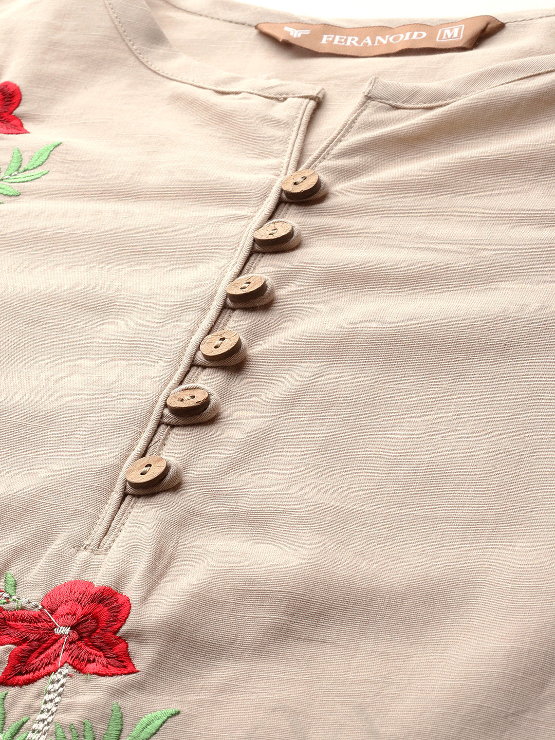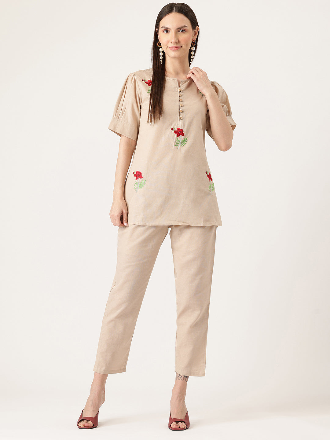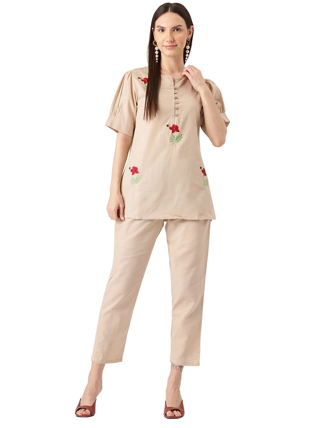 Beige Women's Embroidered Co-ord Set - Viscose Fabric Full Sleeve Shirt and Pant