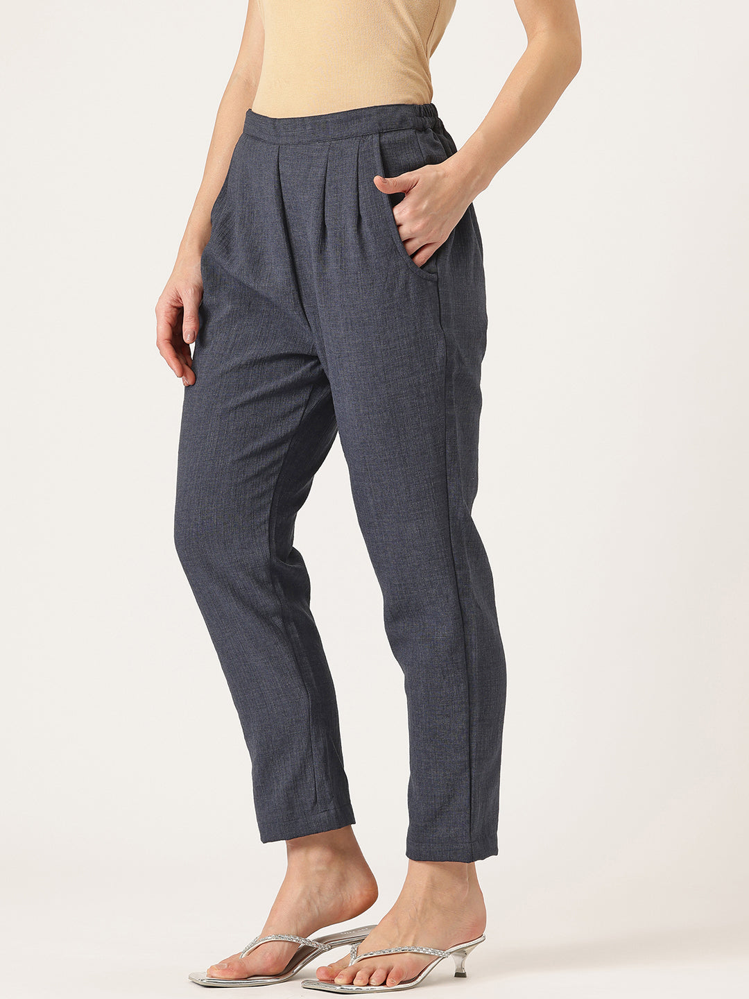 Blue Linen Trouser - Ankle-Length Pant , Partially Elasticated ,Double Pockets