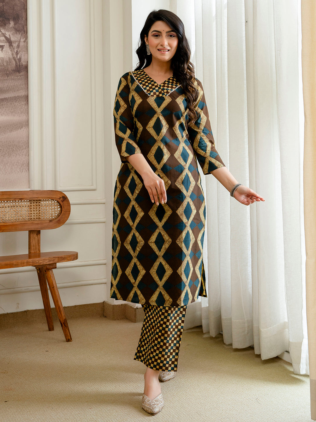 Elevate your ethnic wardrobe with this stunning 3-Piece Kurta Set, a graceful blend of traditional charm and contemporary elegance. The kurta features a beautifully detailed bordered V-neckline that adds a refined touch to the silhouette. Designed with comfortable 3/4 sleeves and a relaxed fit, it offers effortless sophistication for all-day wear.