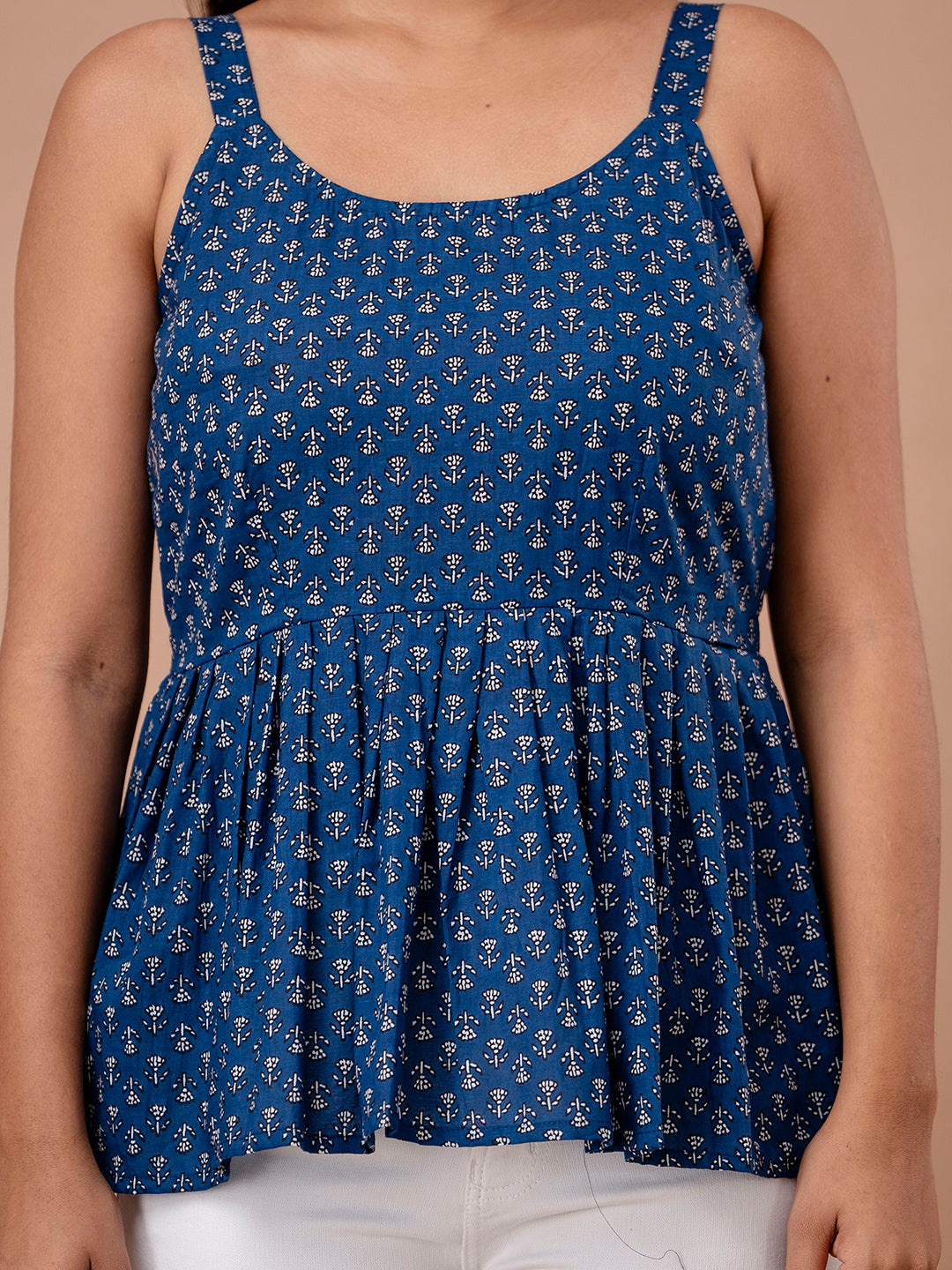 Designed with a round neckline and a sleeveless silhouette, the peplum style is enhanced with delicate gathers that create a flattering, flowy fit. Easy to maintain and versatile to style, this top pairs well with jeans, trousers, skirts, or ethnic bottoms for a chic casual look.