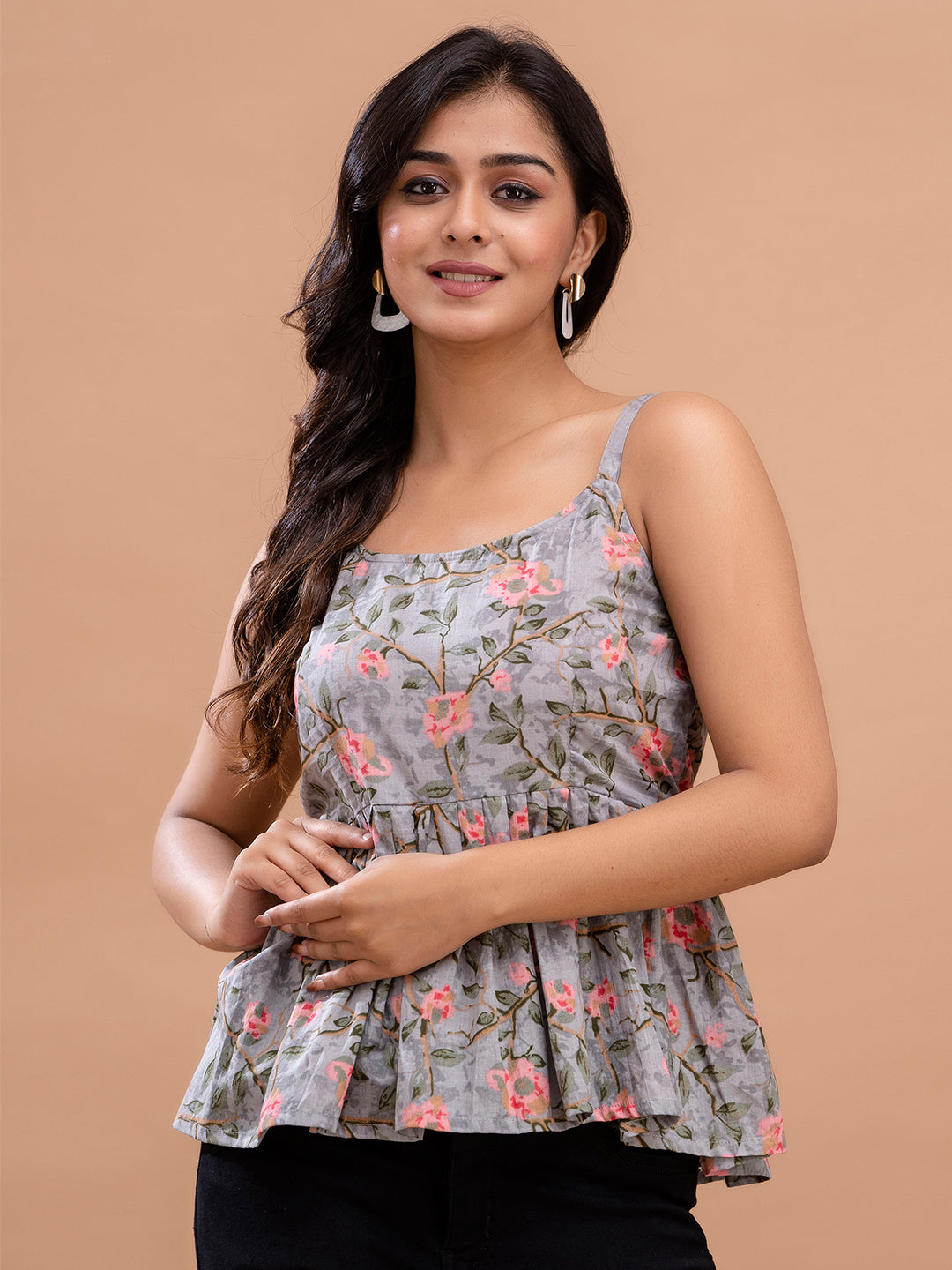 Crafted from soft, breathable cotton with a durable machine weave, it ensures all-day comfort and ease. The charming floral ethnic print enhances its stylish appeal, while the shirt collar and three-quarter sleeves lend a smart, modern look. Designed with gathers for a flattering peplum silhouette, this top is perfect for casual outings, office wear, or day-to-day styling. Easy to care for with convenient machine wash.