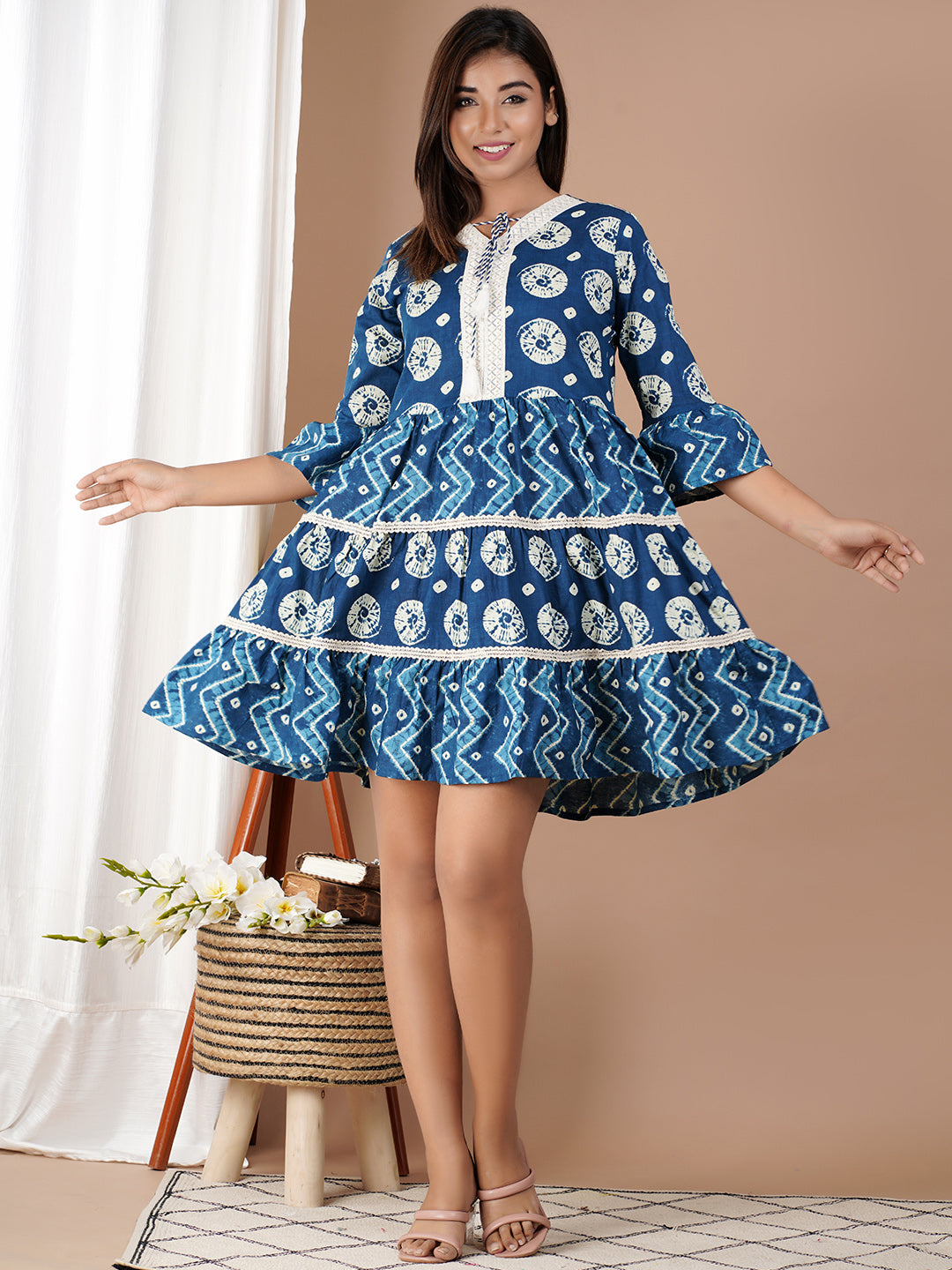This Cotton Printed Navy Blue Tie-Dye Dress is perfect for everyday wear, combining comfort with a trendy ethnic touch. Crafted from pure cotton fabric, it is soft, breathable, and ideal for all-day use. The tie-dye print with ethnic motifs adds a stylish and traditional appeal, while the tie-up neck allows for an adjustable and flattering fit. Featuring three-quarter regular sleeves, a flared hemline, and a fit-and-flare shape, this dress offers a comfortable silhouette and ease of movement. Suitable for casual outings and daily wear.