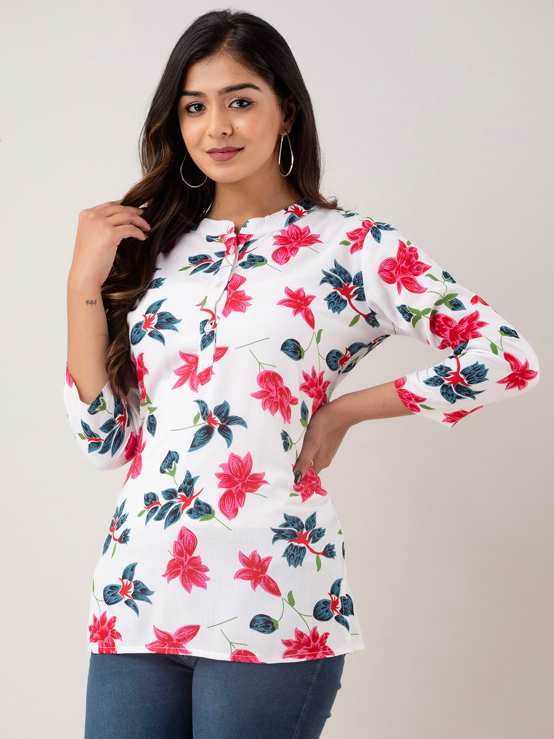 Designed in a classic white shade with subtle prints, this short tunic features a regular straight fit that gives a neat and flattering silhouette. The mandarin collar adds a refined touch, while the three-quarter sleeves ensure ease and versatility. Its mid-thigh length makes it easy to style with a variety of bottoms for both casual and semi-casual occasions.