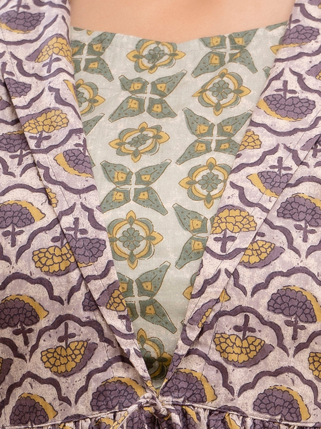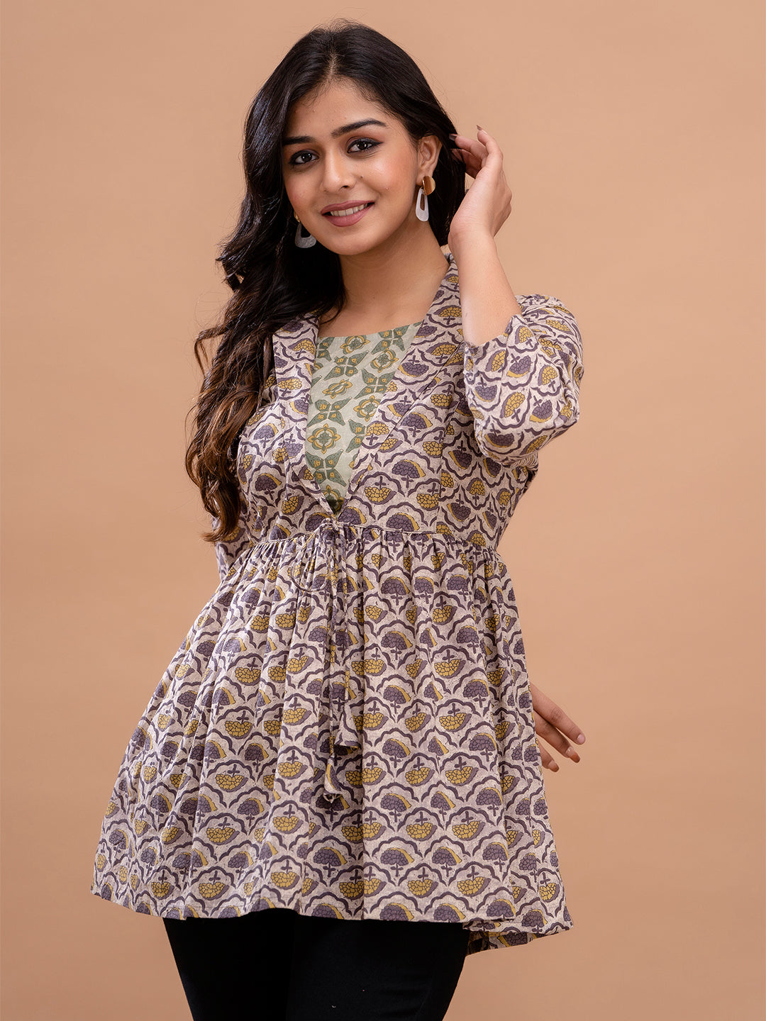 made from soft and breathable pure cotton fabric. Designed for daily comfort, it features a smart shirt collar that adds a modern edge, while the traditional block print brings timeless ethnic charm. The three-quarter regular sleeves and flared hemline create a graceful, flattering silhouette. Easy to care for and versatile in styling, this kurti is perfect for work, casual outings, or daily wear.