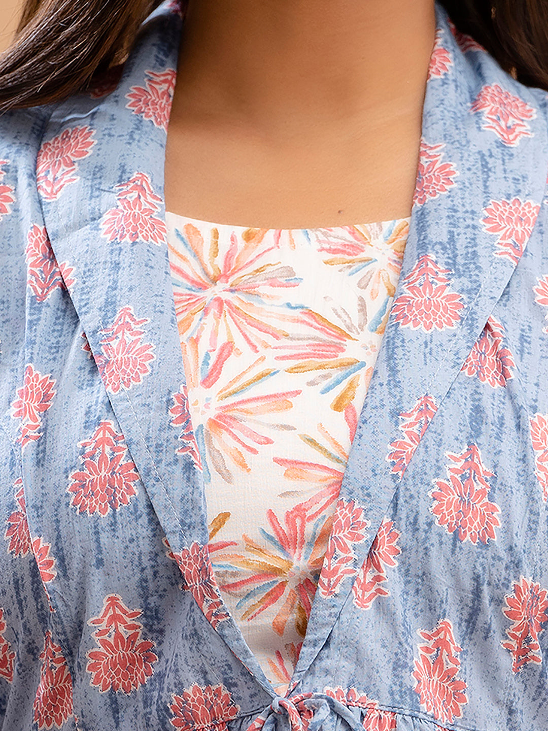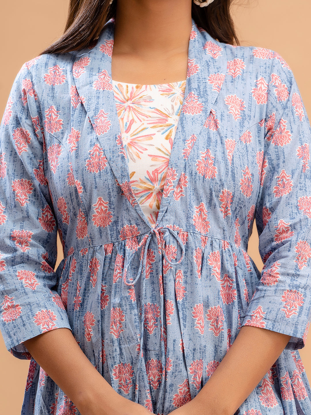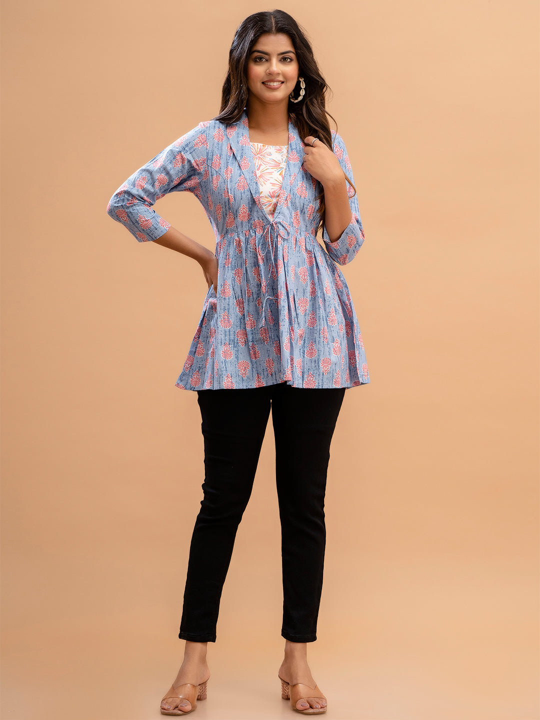 crafted from soft and breathable pure cotton fabric. Featuring a smart shirt collar and elegant block print, this kurti blends traditional charm with a contemporary touch. The three-quarter regular sleeves and flared hemline create a graceful silhouette, making it ideal for comfortable and stylish daily wear. Easy to maintain and versatile, it pairs beautifully with leggings, palazzos, or straight pants.