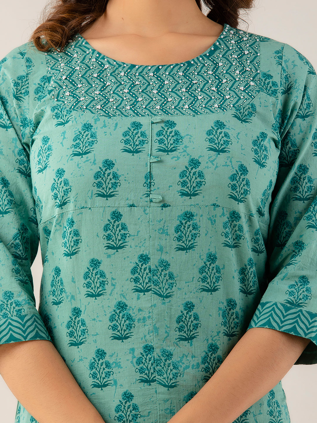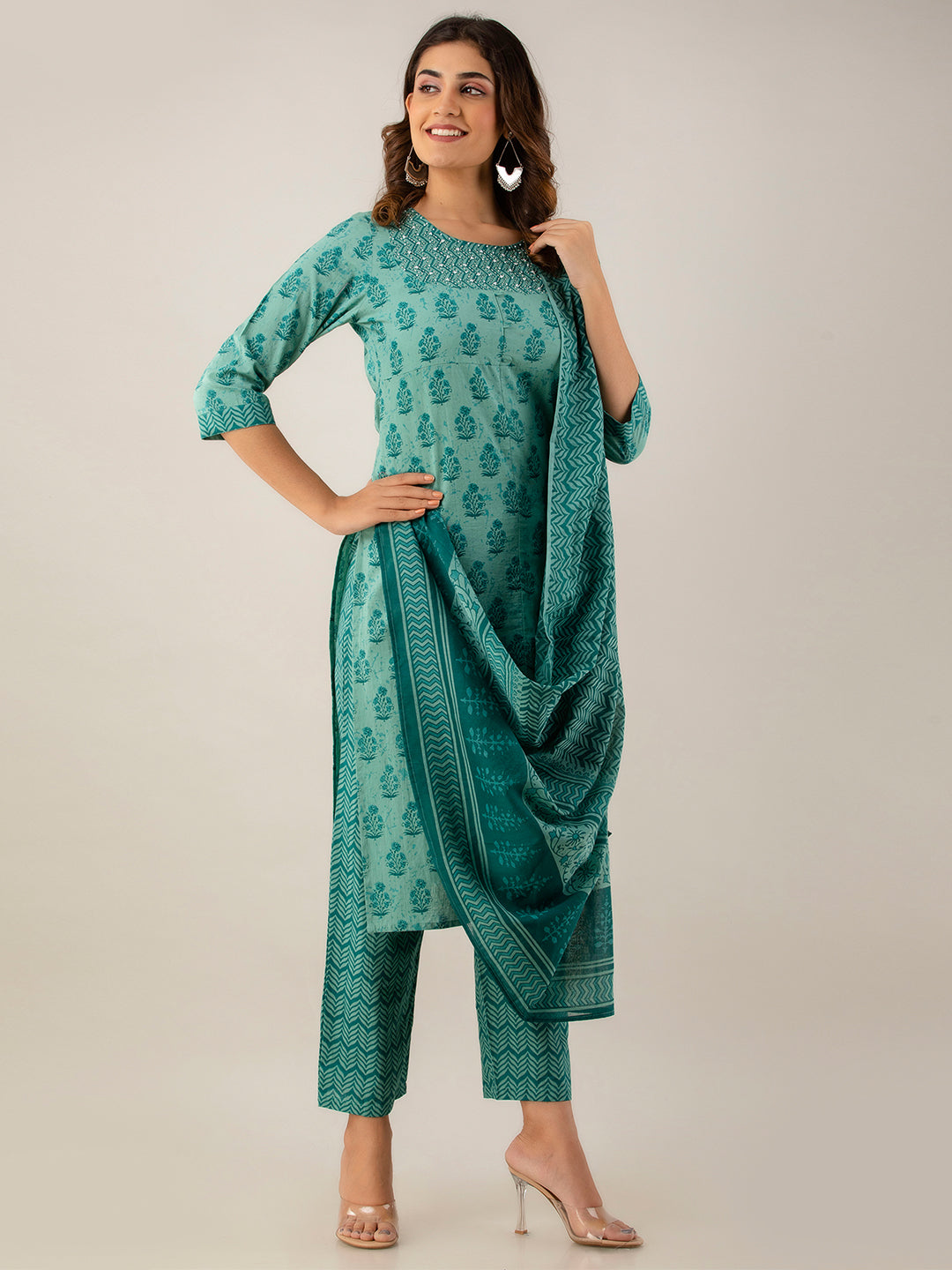 The straight-cut calf-length kurta with a round neck and three-quarter sleeves offers a graceful silhouette. Featuring floral prints with large pattern coverage, it adds a vibrant festive charm. The set includes printed slip-on trousers with an elasticated waistband and a matching printed dupatta with a solid border, making it perfect for celebrations and traditional gatherings.