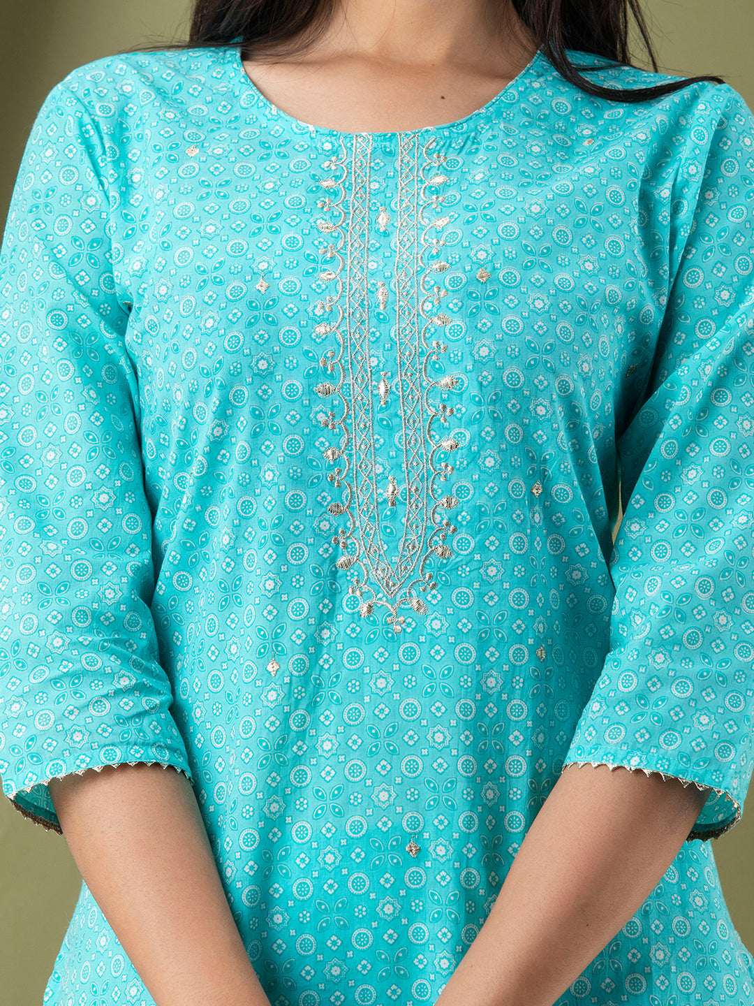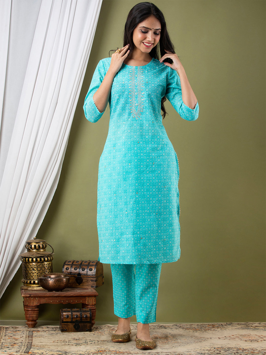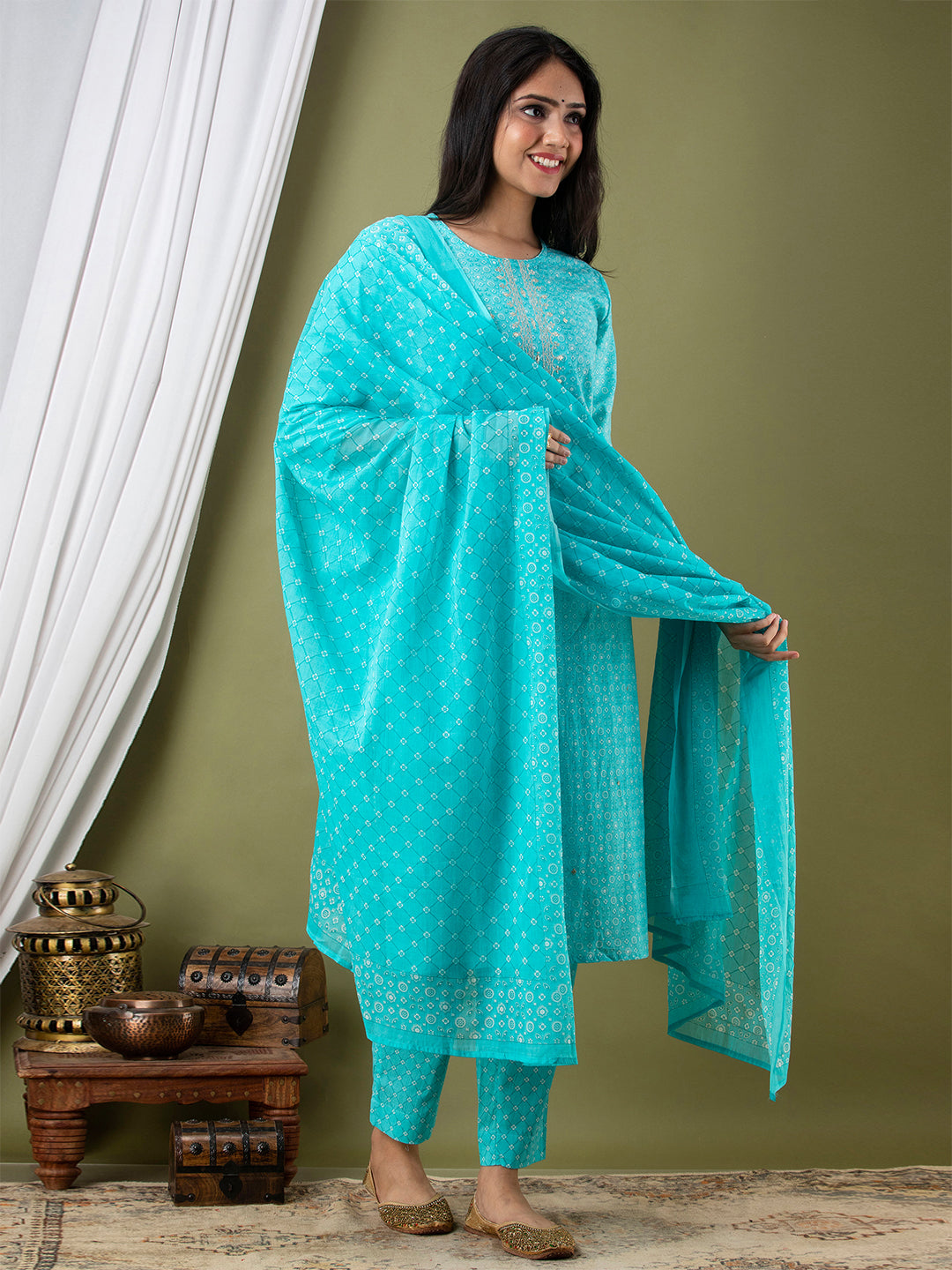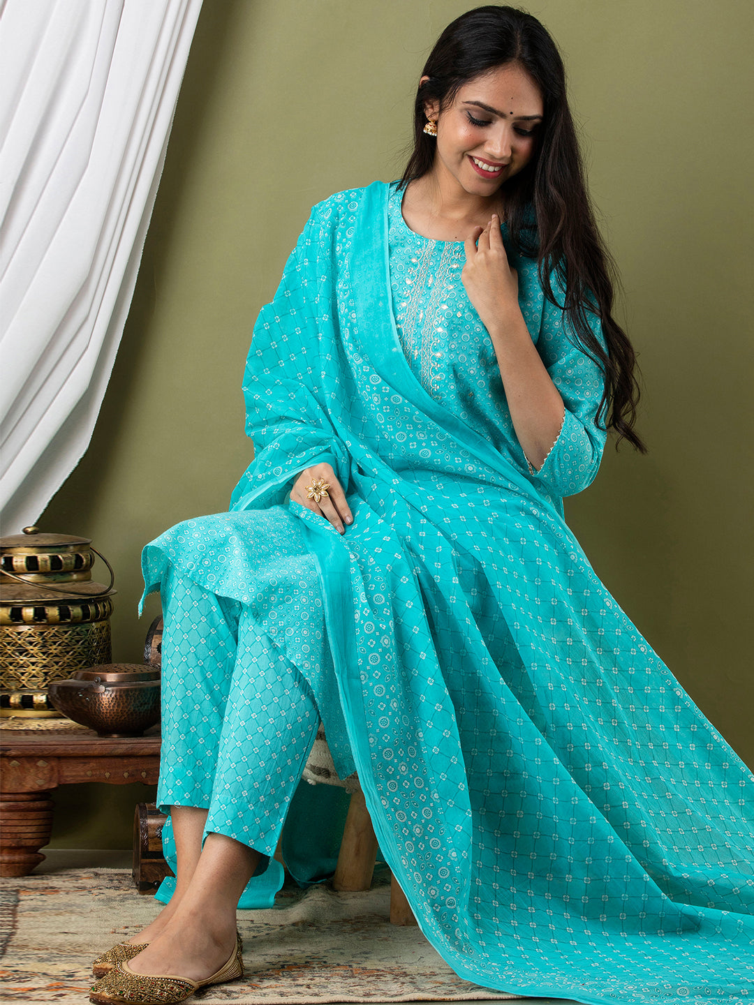 The straight-cut calf-length kurta with a round neck and three-quarter sleeves offers a graceful look. Adorned with floral prints, thread work, and large pattern coverage, it adds a charming festive touch. The set includes printed slip-on trousers with an elasticated waistband and a matching printed dupatta, making it perfect for celebrations and traditional gatherings.