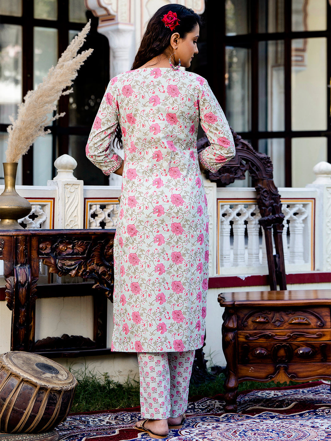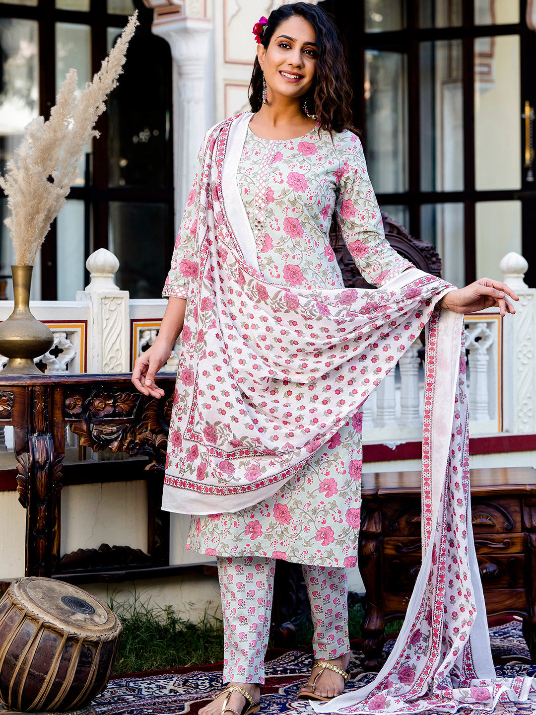 The straight-cut knee-length kurta with a mandarin collar and three-quarter sleeves offers a graceful look. Printed ethnic motifs with large coverage add festive charm. The set includes slip-on trousers with an elasticated waistband and a matching printed dupatta with a solid border, making it perfect for celebrations and traditional occasions.