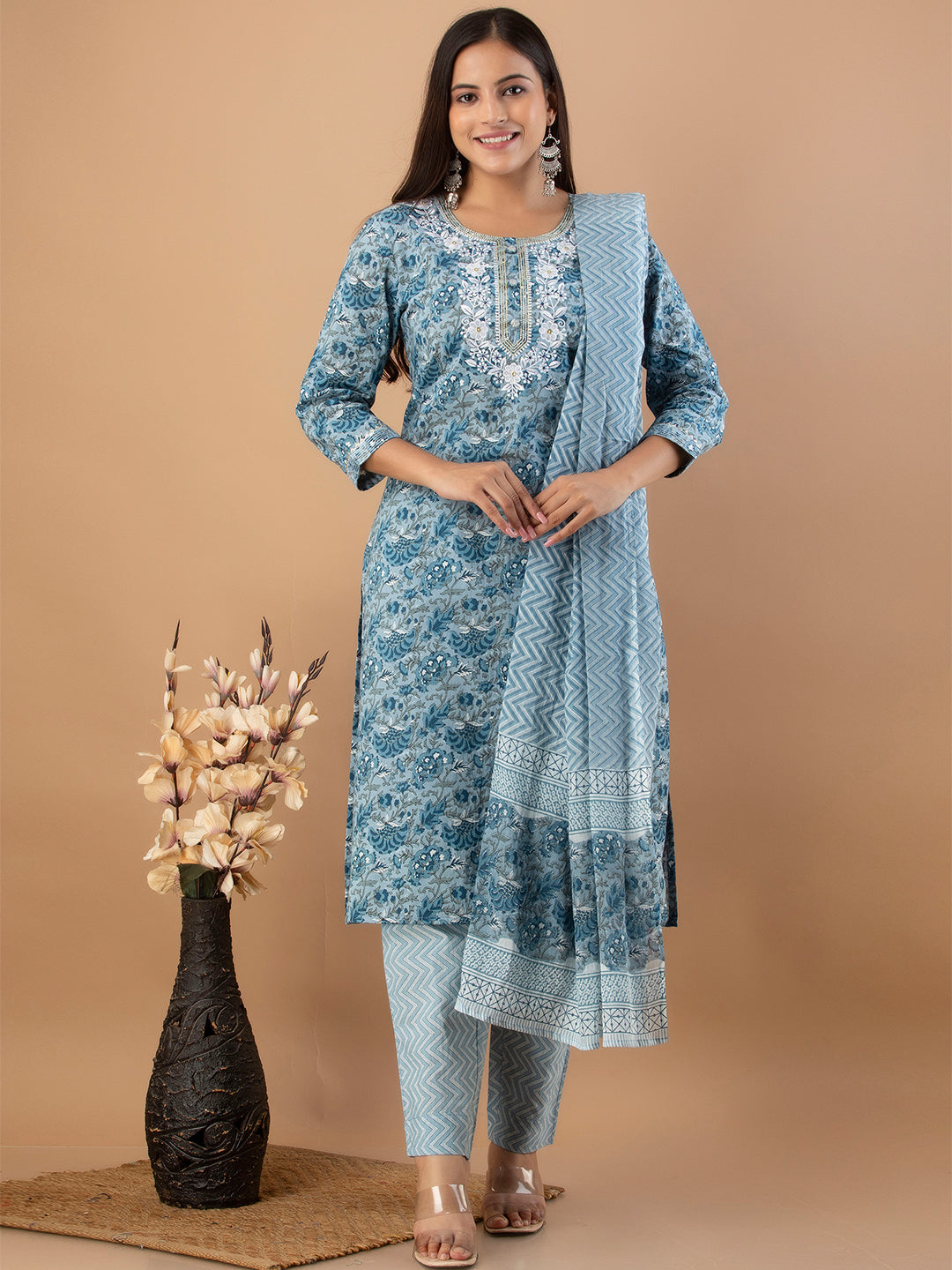 This Women Kurta Pant Dupatta Set is thoughtfully designed for festive occasions, blending traditional aesthetics with everyday comfort. The straight-cut kurta features a smart mandarin collar and three-quarter sleeves, giving it a structured yet elegant look. Decorated with printed ethnic motifs and large pattern coverage, the kurta stands out with a rich festive appeal. It is paired with printed trousers featuring a slip-on closure and an elasticated waistband for ease and comfort. The look is completed with a matching printed dupatta finished with a solid border, adding a refined touch to the overall ensemble.