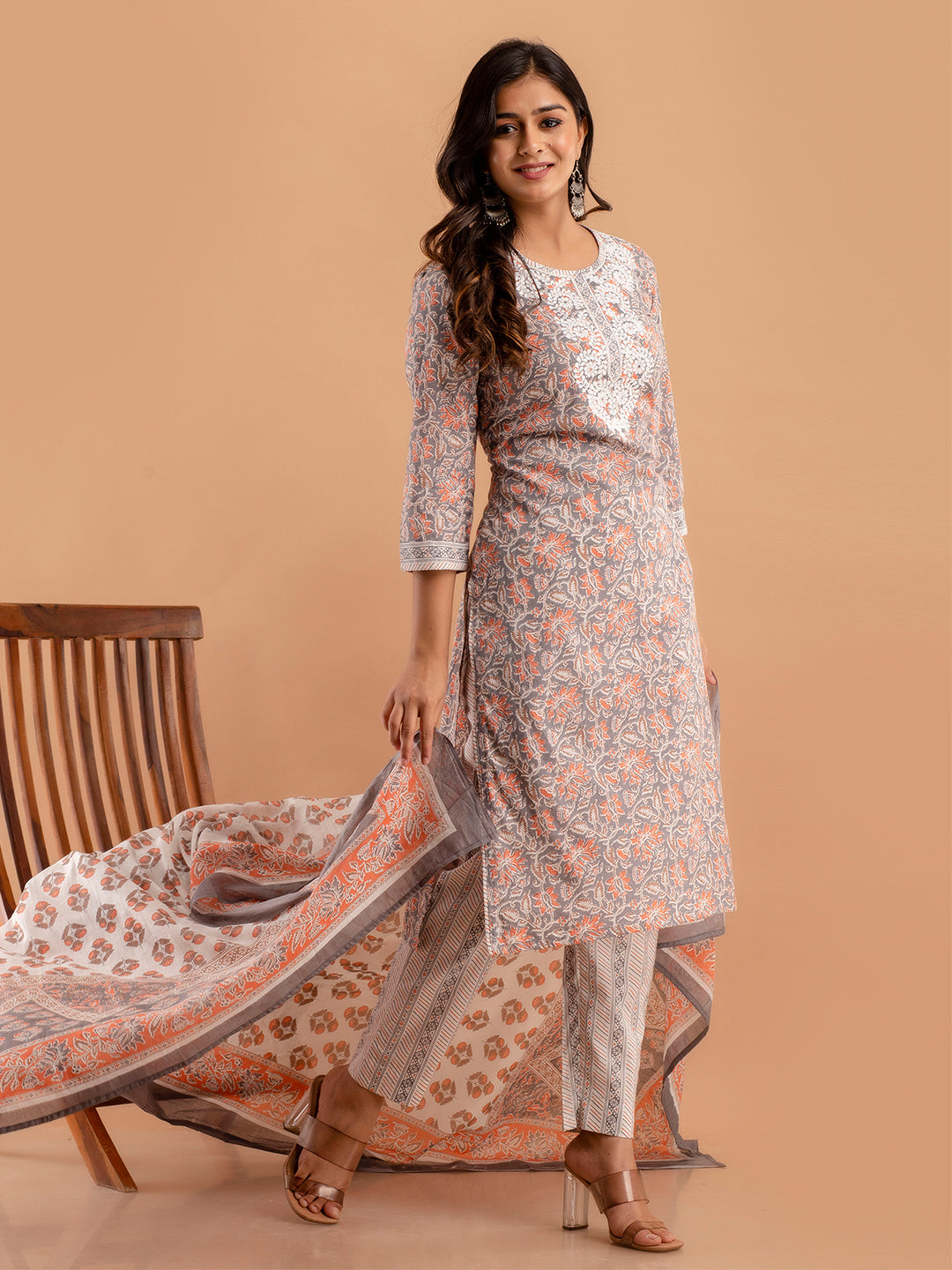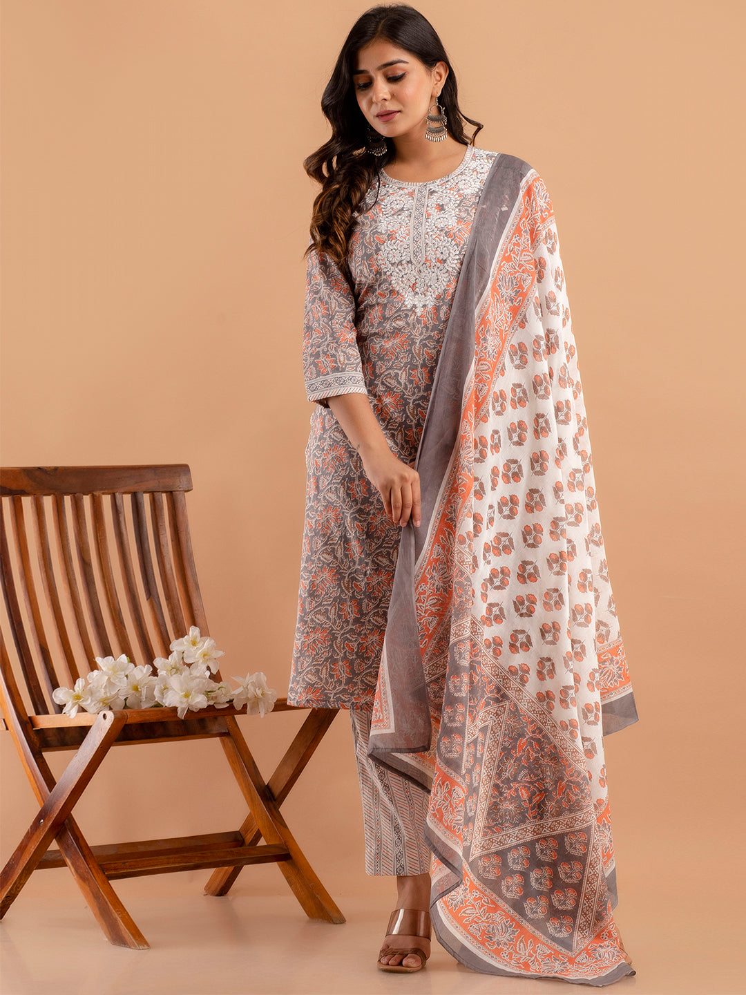 This Women Kurta Pant Dupatta Set is an elegant choice for festive occasions, combining traditional design with modern comfort. The straight-fit kurta features a stylish mandarin collar and three-quarter sleeves, giving it a refined and graceful appearance. Decorated with printed ethnic motifs and large pattern coverage, the kurta stands out with a rich ethnic appeal. The set includes printed trousers with a slip-on closure and elasticated waistband for ease and comfort. A matching printed dupatta with a solid border completes the look, making it perfect for celebrations and festive gatherings.