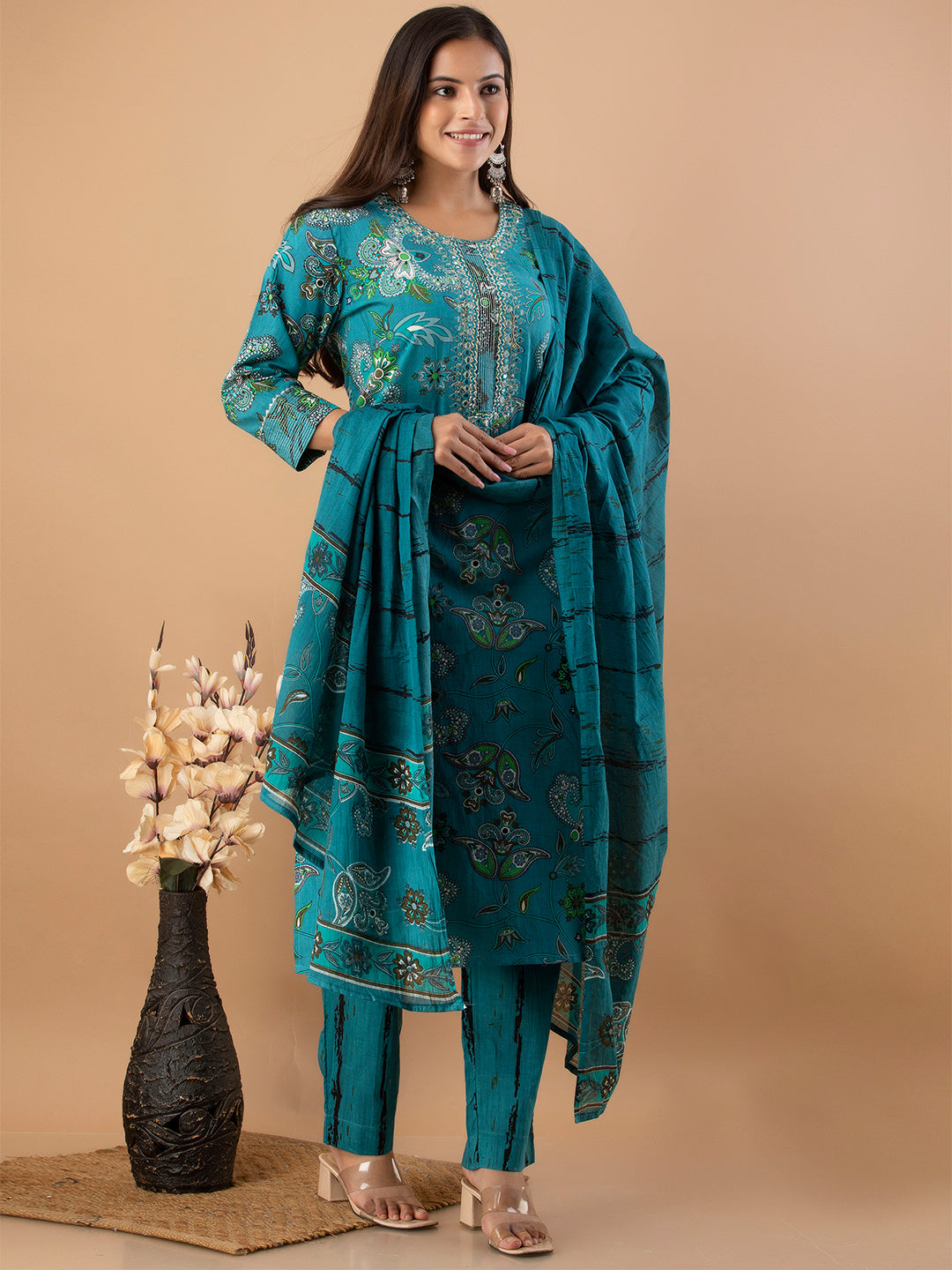 This elegant Women Kurta Pant Dupatta Set is designed to bring together comfort and festive style. The straight-shaped kurta features a stylish mandarin collar and three-quarter sleeves, offering a refined and flattering silhouette. Adorned with printed ethnic motifs and large pattern coverage, the kurta reflects a rich traditional appeal. Paired with printed trousers featuring an elasticated waistband and slip-on closure, this set ensures ease of movement and all-day comfort. The matching printed dupatta with a solid border completes the festive look, making it ideal for celebrations and special occasions.
