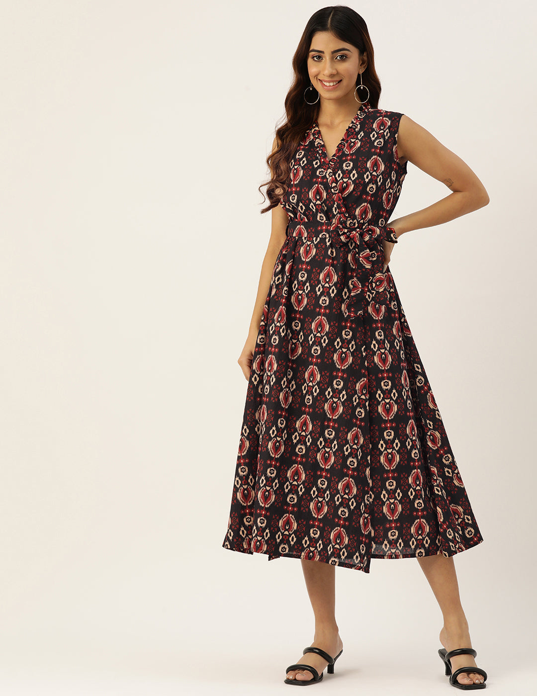 Add timeless elegance to your daily wardrobe with this Wrap Around Angrakha Dress. Crafted from pure cotton fabric, it ensures breathability and all-day comfort. The printed ethnic motifs bring a traditional charm, while the tie-up neck highlights the classic Angrakha style with an adjustable and secure fit. Featuring three-quarter regular sleeves, a flared hemline, and a fit-and-flare shape, this dress offers a flattering silhouette and easy movement, making it ideal for everyday wear and casual outings.