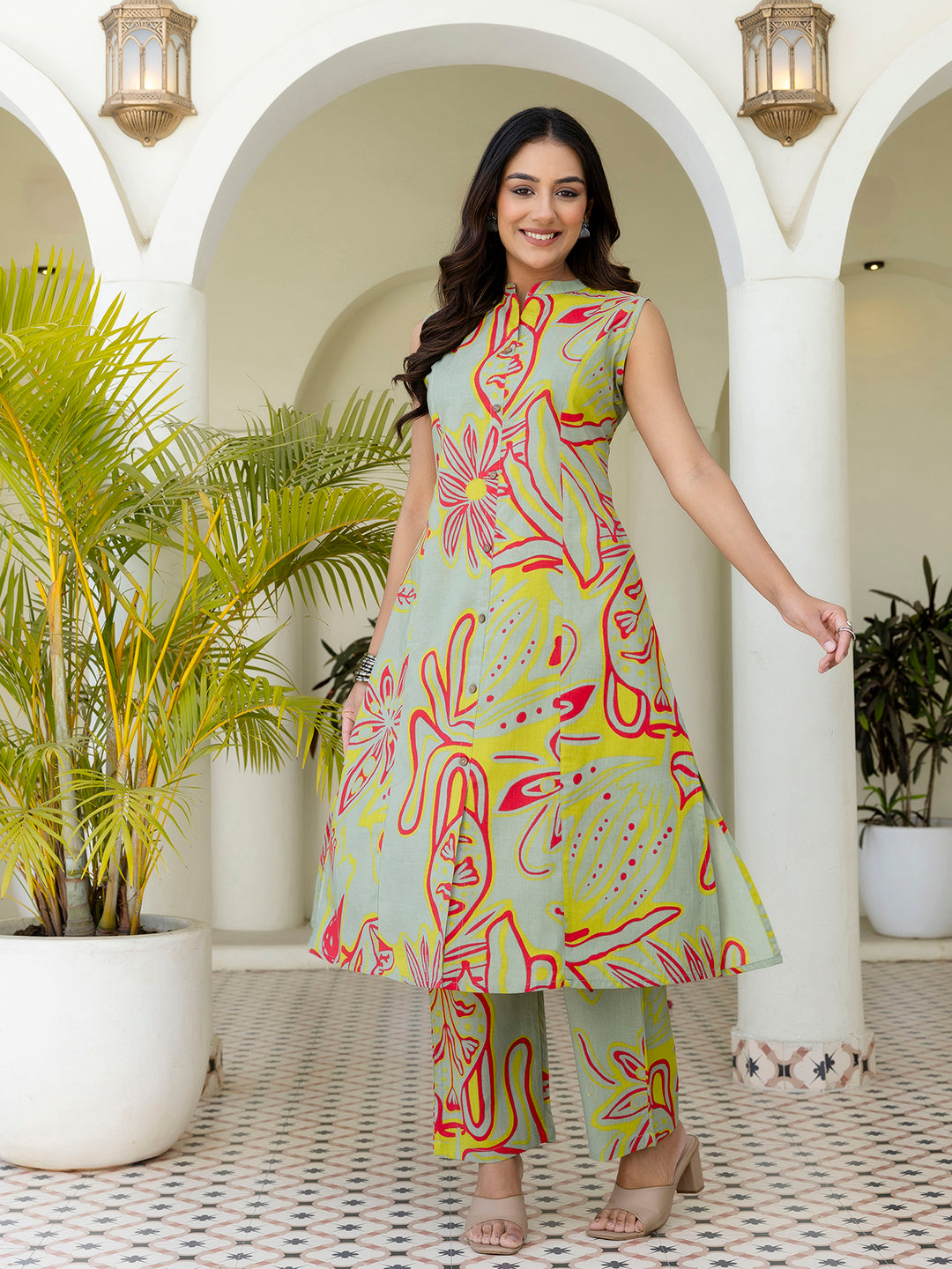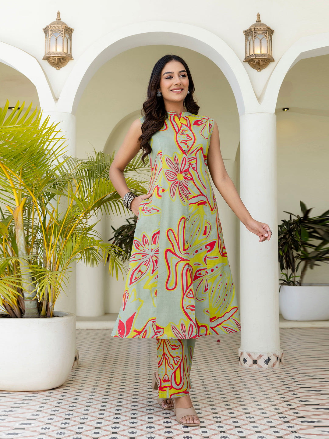 Elevate your everyday style with our chic Co-Ord Set, thoughtfully designed to combine modern elegance with effortless comfort. The A-line kurta features a stylish mandarin collar neckline with button detailing, lending a refined yet contemporary appeal to the silhouette. Designed in a sleeveless pattern, it offers a breezy and flattering fit, while the double functional pockets add both practicality and a relaxed charm. Crafted from soft, breathable fabric, the kurta pairs perfectly with ankle-length pants featuring a fully elasticated waistband for all-day comfort and ease of movement. Available in a variety of prints and colours, this versatile co-ord set can be styled with flats for casual outings or elevated with heels and statement accessories for office wear, brunch dates, or weekend plans. With its clean lines and timeless design, this set is a must-have addition to your modern wardrobe.