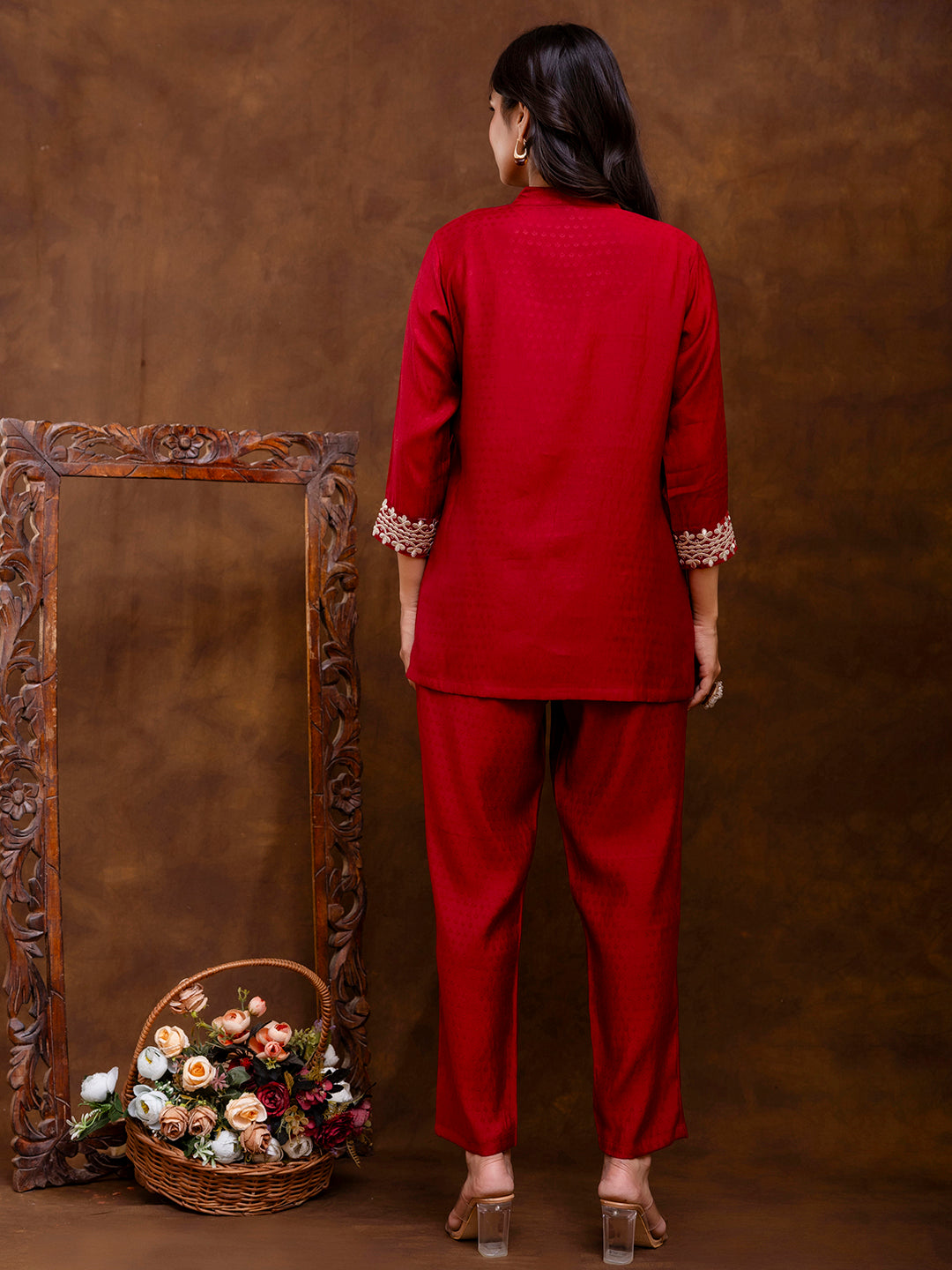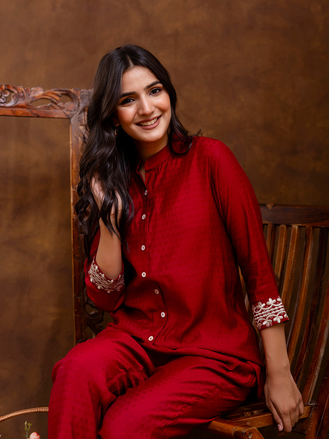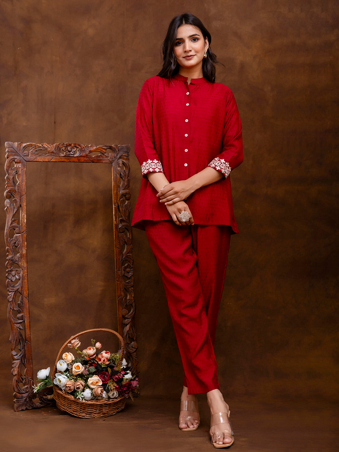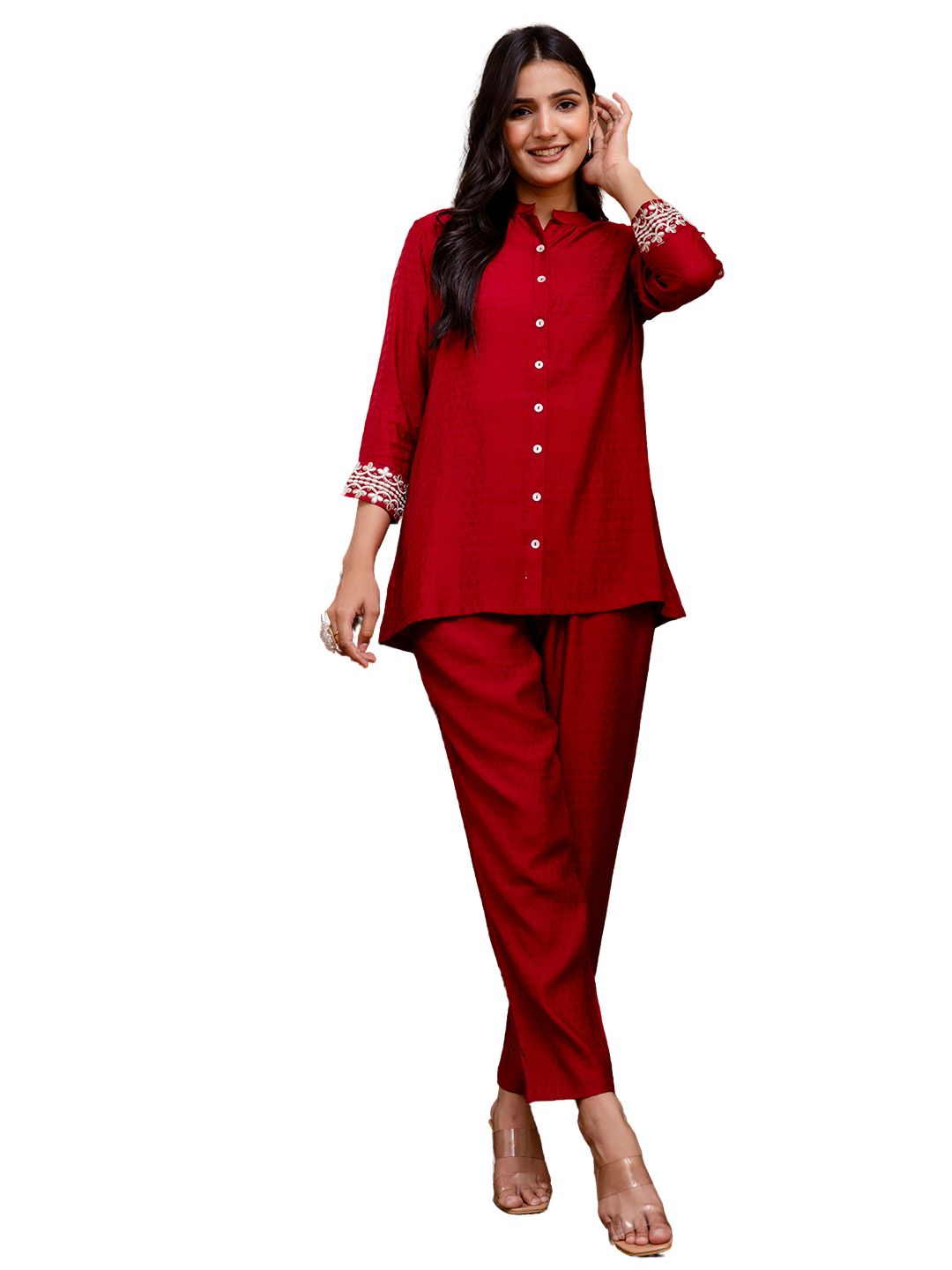 This set features a sharp collared neckline that brings structure and refinement, offering a polished, tailored look that transitions effortlessly from day to night. Crafted from premium viscose fabric, it offers a smooth texture and beautiful drape that enhances your overall silhouette.The full sleeve shirt features intricate embroidery detailing that adds a sophisticated charm to the outfit. Paired with matching pants tailored for a comfortable and flattering fit, this co-ord set is perfect for festive events, office wear, dinner outings, and special occasions.