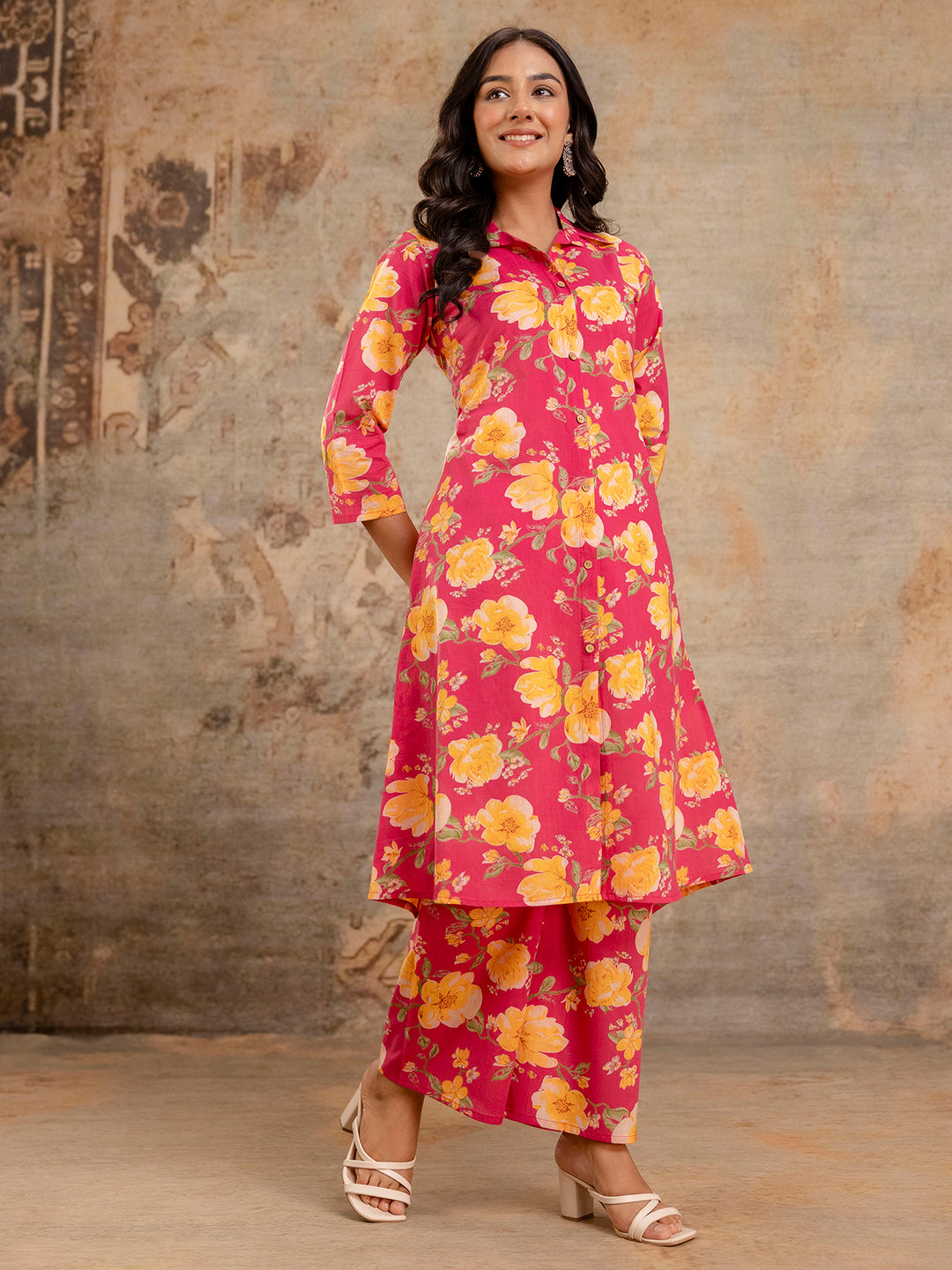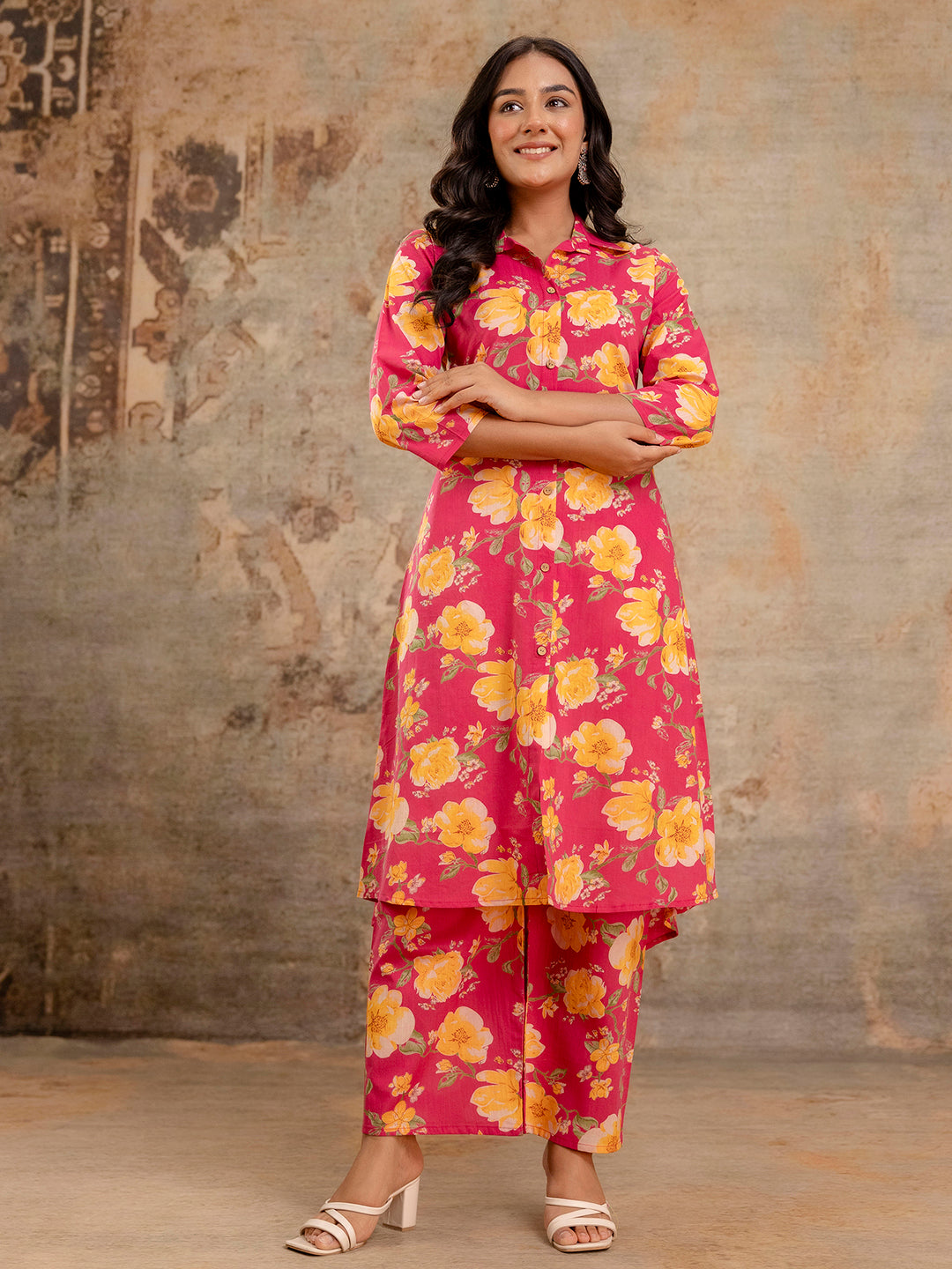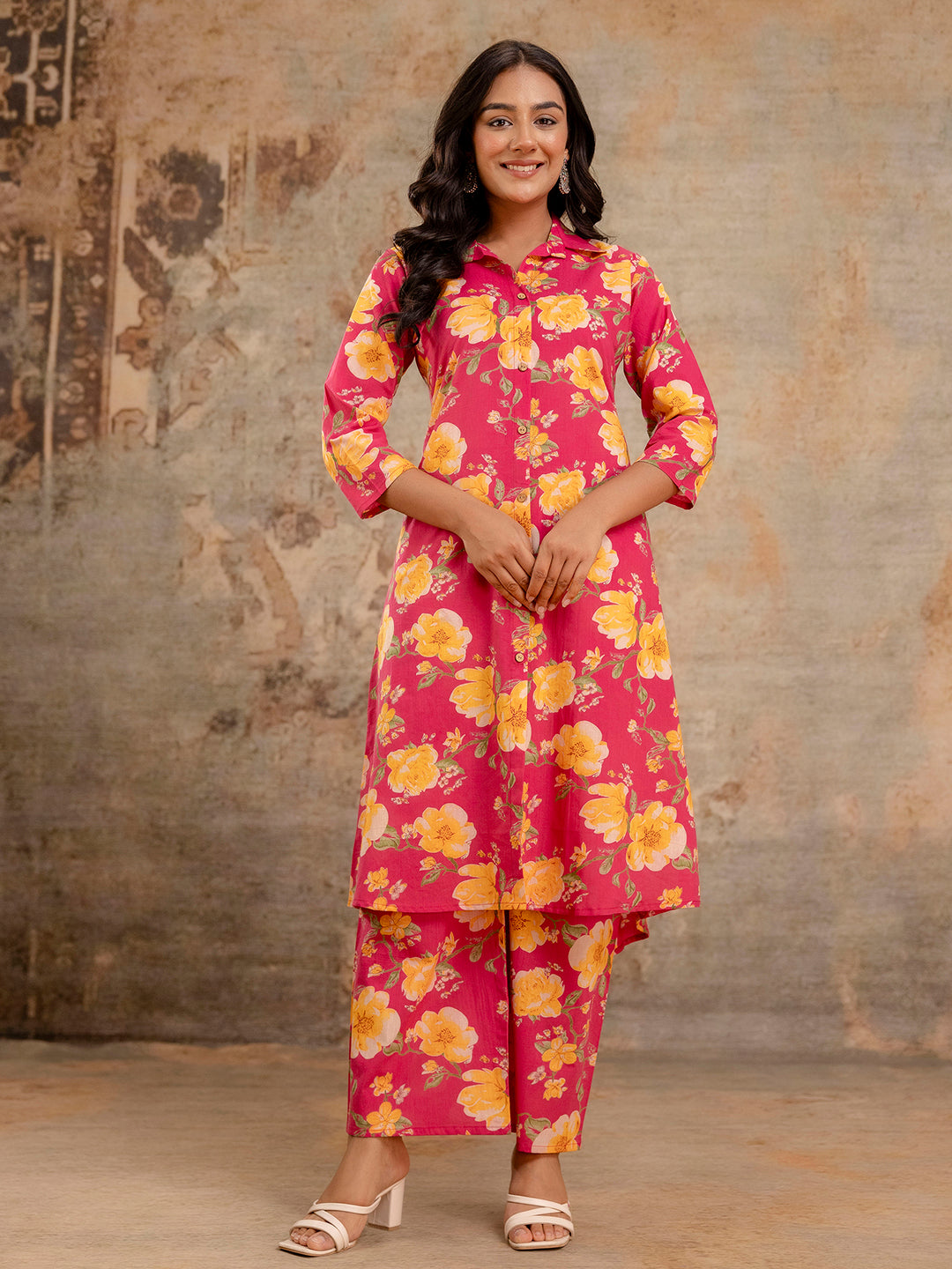 Crafted from soft, breathable fabric, the kurta offers a flattering silhouette while the fully elasticated ankle-length pants ensure all-day ease and flexibility. Whether paired with flats for a casual outing or dressed up with heels and accessories for a more refined look, this set is perfect for office days, lunch dates, or weekend plans. The printed collared kurta with 3/4 sleeves offers a smart and refined look, perfect for both casual and semi-formal occasions.Paired with elastic waist pants, this set ensures a flexible and comfortable fit for all-day wear. The breathable fabric and eye-catching print make it ideal for office wear, festive gatherings, travel, or daily outings.